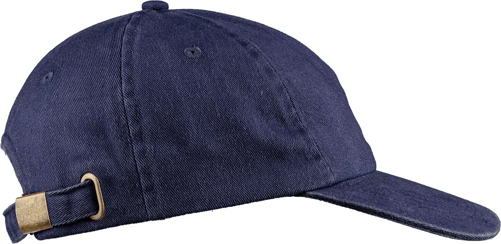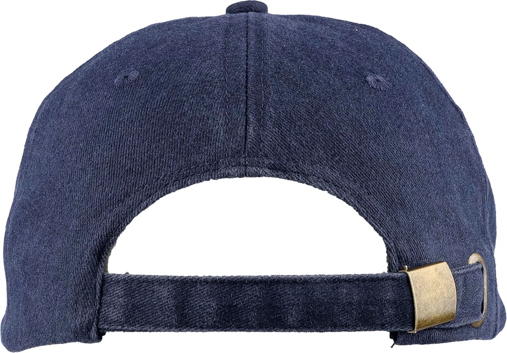 Einteilige Mütze aus gewaschener Baumwolle (240 g/m2) mit 5-Panel-Design und 7 cm breitem Schirm. Verstellbarer Verschluss mit Messingschnalle. Innen nicht gefüttert.