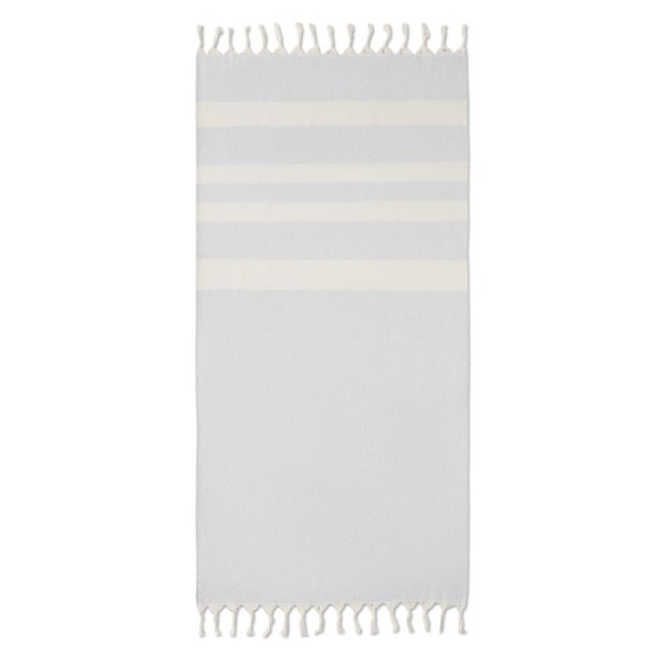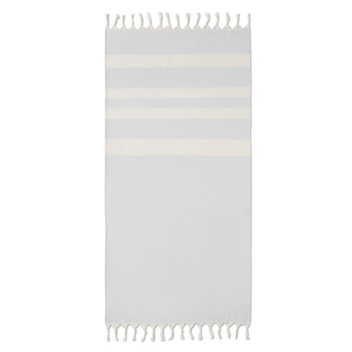 Strandtuch/Hamamtuch aus recycelten Stoffen: recycelter Baumwolle (45%) und recyceltem Polyester (55%). . 140 g/m².