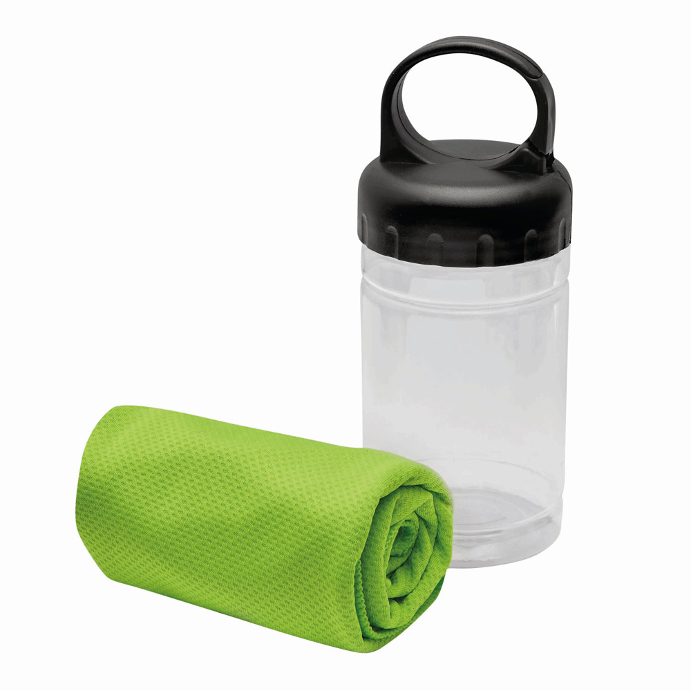 Kühlhandtuch CHILLING: in transparenter Dose, integrierter Sonnenschutzfaktor, für einen lang anhaltenden Kühleffekt Handtuch mit Wasser befeuchten und schleudern oder Wasser zur Dose hinzugeben und gut schütteln, Deckel mit Karabinerhaken (der Karabiner ist NICHT als Sicherung beim Klettern geeignet) - ideal für Fitness und Sportaktivitäten