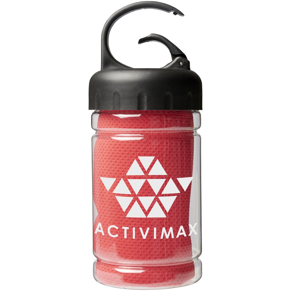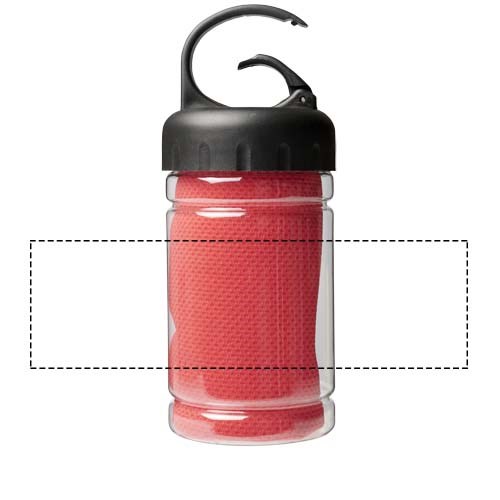 Schnell einziehendes, schnell trocknendes und waschbares kühlendes Handtuch aus starkem und strapazierfähigem Polyester, perfekt um während des Trainings oder bei allen Outdoor-Aktivitäten kühl zu bleiben. Wird in einem PET-Behälter mit Tragegriff und integriertem Karabinerhaken für einfaches Tragen geliefert. Erhältlich in 5 frischen Farben. Große Deko-Logofläche auf dem Behälter, Dekoration auch auf dem Kühlhandtuch selbst möglich. Größe 30 x 80 cm.