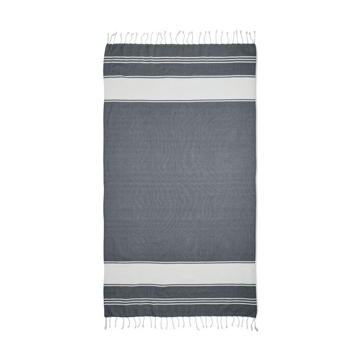Strandtuch/Hammamtuch im passenden Beutel mit Kordelzug. 70% recycelte Baumwolle und 30% recycelter Polyester 180 g/m². Maße Tuch: 90x160 cm.