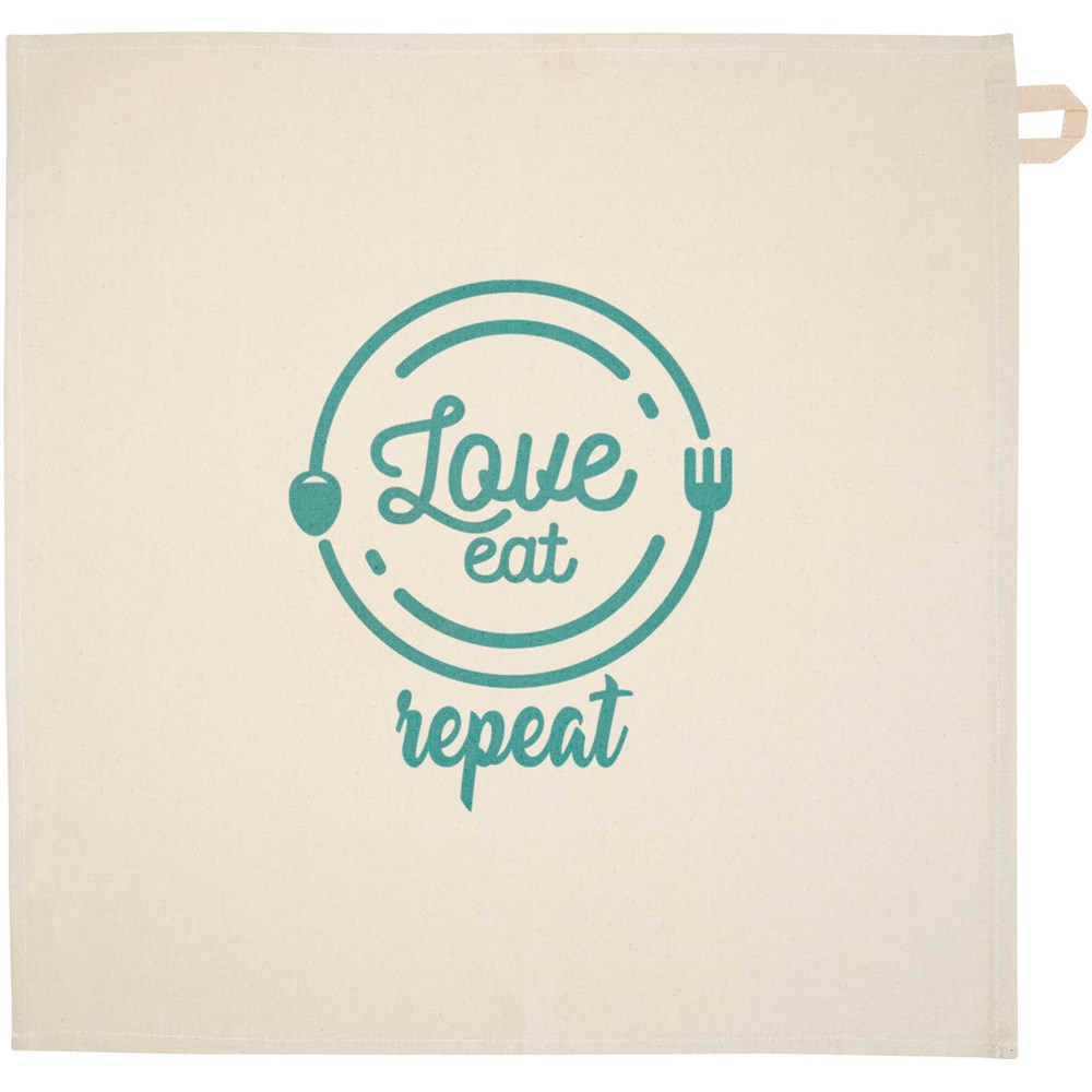 Küchentuch aus 100 % GRS-zertifizierter Recyclingbaumwolle mit einem Gewicht von 200 g/m² und einer auffälligen, kontrastfarbigen Schleife. Größe des Handtuchs: 50 x 50 cm.