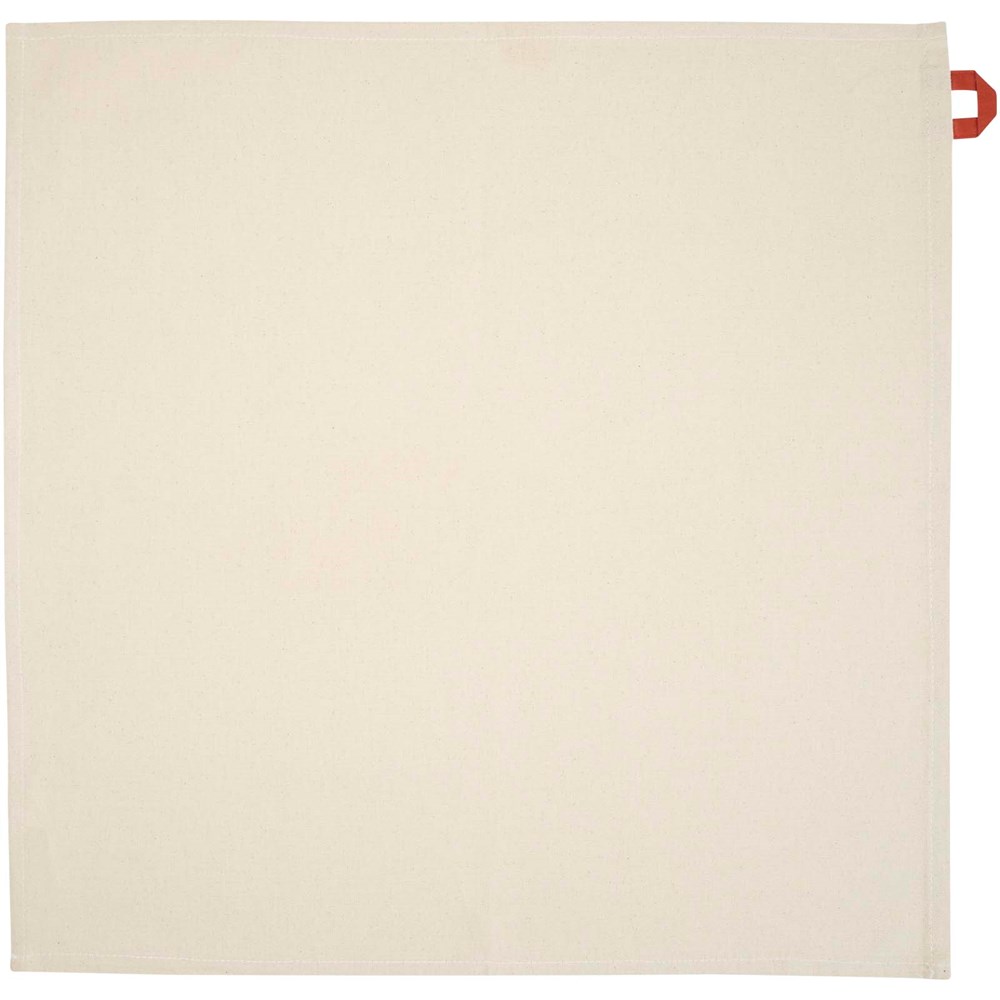 Küchentuch aus 100 % GRS-zertifizierter Recyclingbaumwolle mit einem Gewicht von 200 g/m² und einer auffälligen, kontrastfarbigen Schleife. Größe des Handtuchs: 50 x 50 cm.