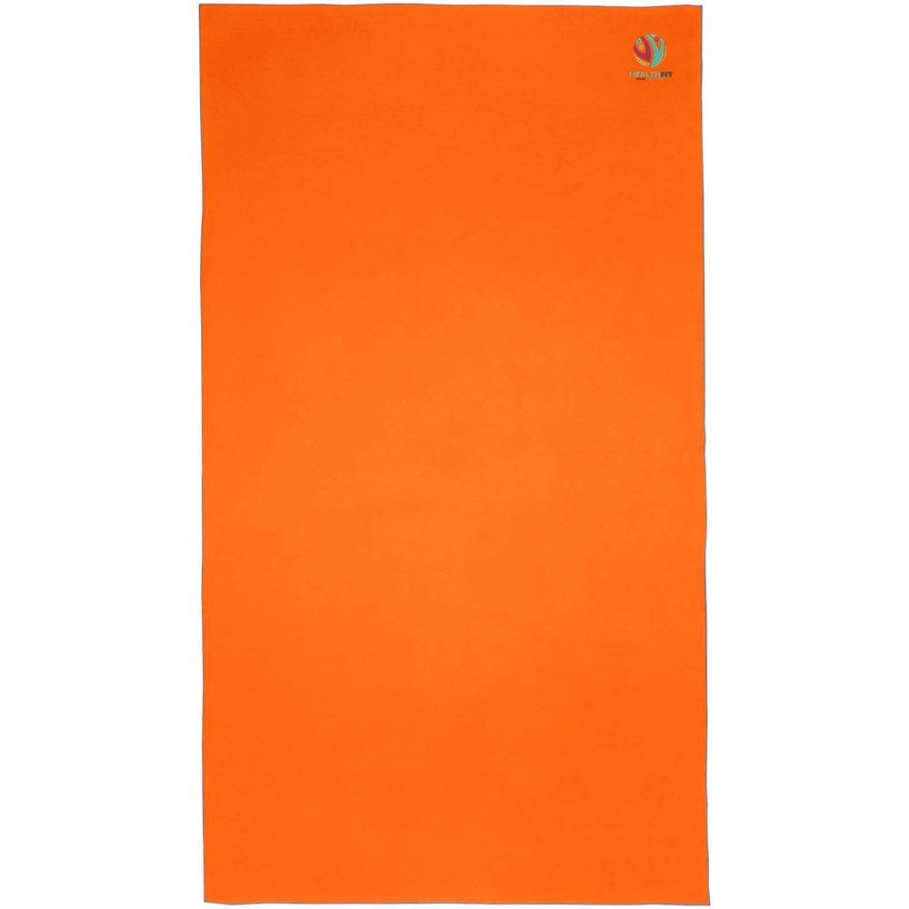 Die Pieter Sporthandtuch saugt sehr gut auf, ist leicht, trocknet schnell und der Stoff ist langlebig und extrem weich. Gefaltet und mit dem Gummiband gesichert ist das Handtuch klein und handlich, gut für Fitnessstudio, Schwimmbad oder für Rucksacktouren und Camping. Das Handtuch hat eine Größe von 180 × 100 cm und besteht zu 90% aus GRS-recyceltem Polyester und zu 10% aus Nylon. Es kann bei 40 °C in der Maschine gewaschen werden. Das Handtuch wird mit einem Aufbewahrungsbeutel (25 × 8,5 cm) aus recyceltem PET-Kunststoff geliefert, der sich hervorragend für den Aufdruck eines Logos eignet.