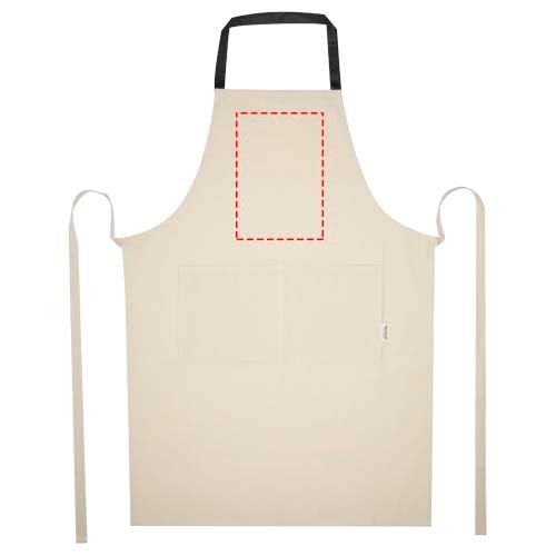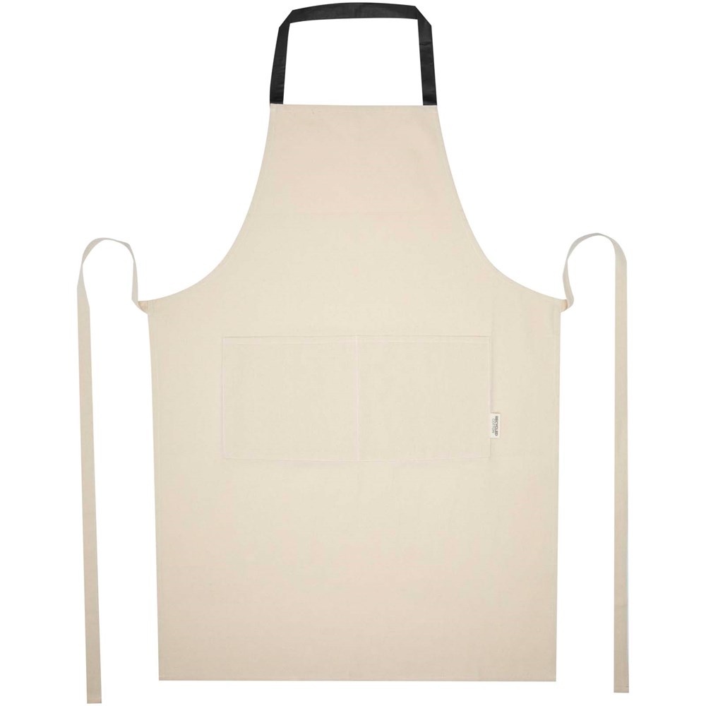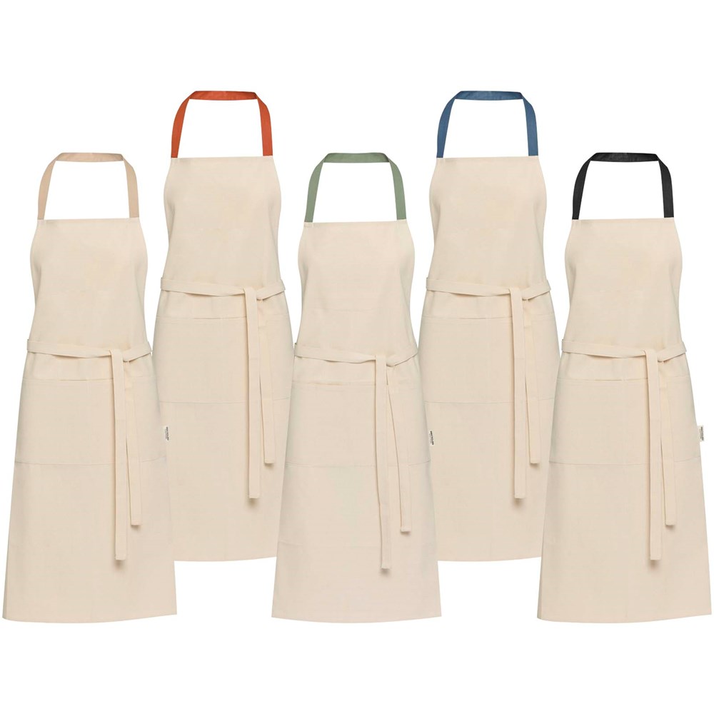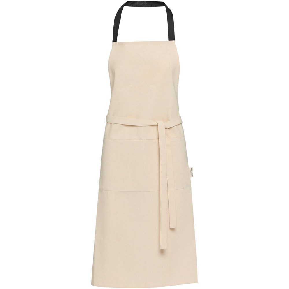 Die Nia Schürze ist aus 100 % GRS-zertifizierter Recyclingbaumwolle mit einem Gewicht von 200 g/m² gefertigt. Mit ihrer natürlichen Baumwollfarbe und dem kontrastfarbigen Kragenband schützt diese Schürze Ihre Kleidung beim Kochen. Die zwei nebeneinander liegenden Taschen mit einer Gesamtgröße von 45 × 20 cm und die 1 Meter langen Schürzenbänder machen die Nia Schürze zu einem praktischen und stilvollen Küchenhelfer.