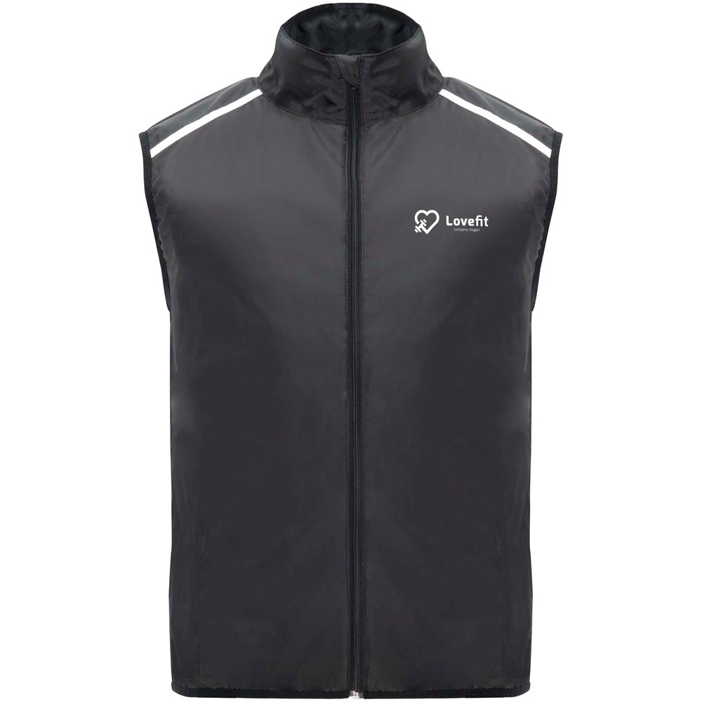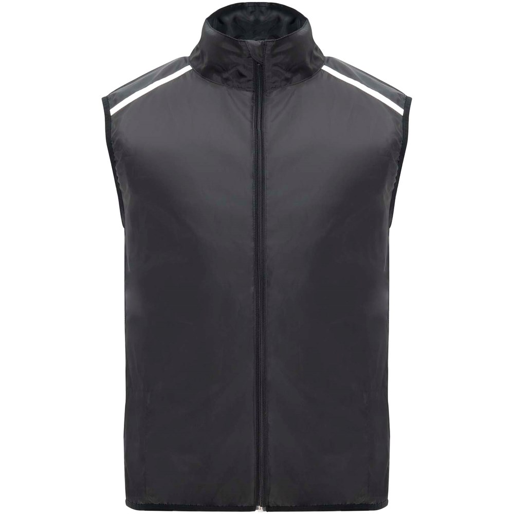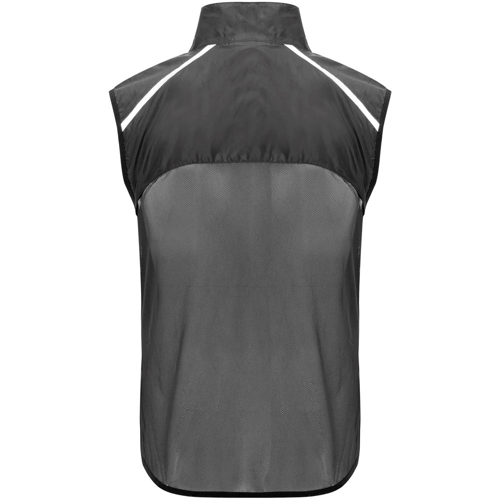 Leichte Funktions - Laufweste, winddicht und atmungsaktiv. Frontreißverschluss mit passendem Kinnschutz. Elastische Einfassung am Armausschnitt und Saum. Untere Rückenpartie aus mikroperforiertem Stoff. Reflektierende Details auf den Schultern, Front- und Rückseite. Tasche mit elastischem Band zum Verstauen der Weste und zum Tragen am Handgelenk. Abnehmbares Etikett.