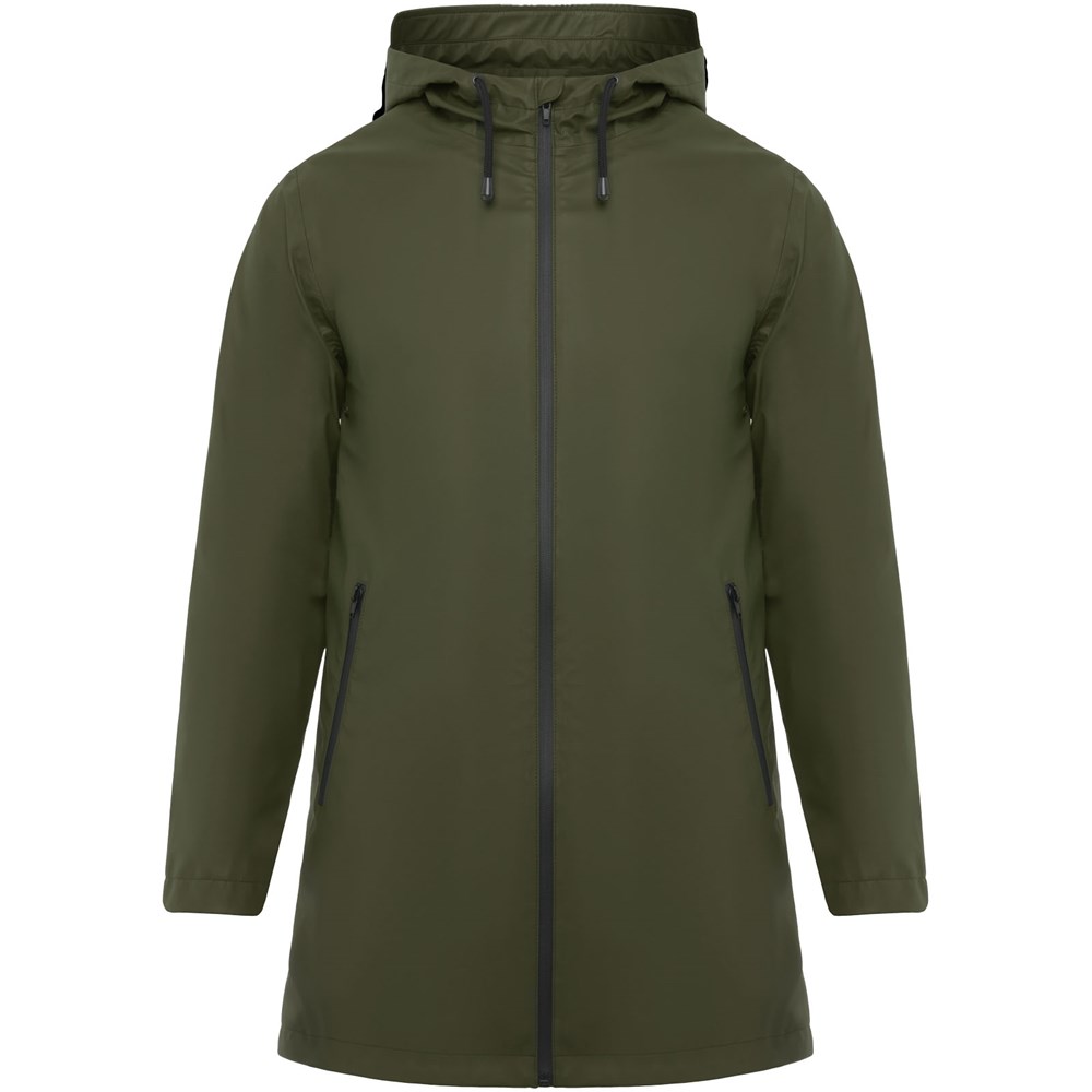 Wasserdichter Regenmantel. Kapuze mit Visier. Hitzeversiegelte Reißverschlüsse und Nähte. Kontrastierende Details in Schwarz. Zwei Seitentaschen mit Reißverschluss. Schlitz am hinteren Saum. Herausnehmbares Etikett. Wasserdicht. Das Modell ist 185 cm groß und trägt Größe M.