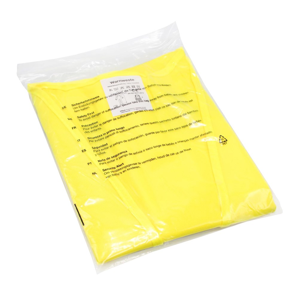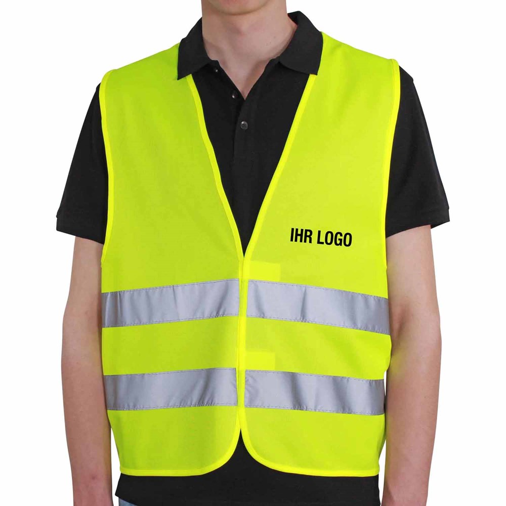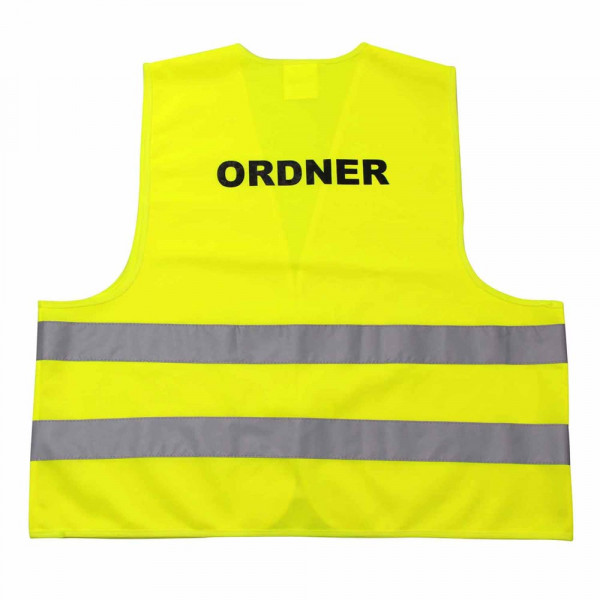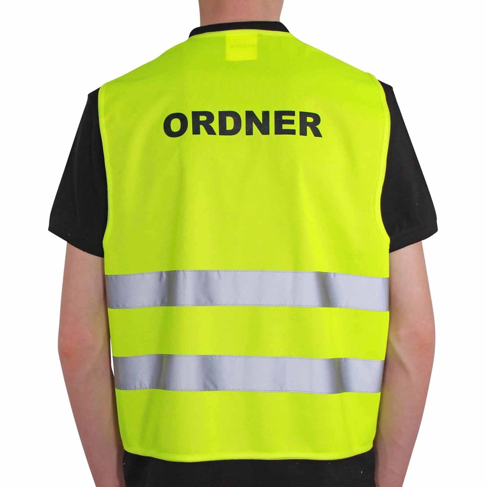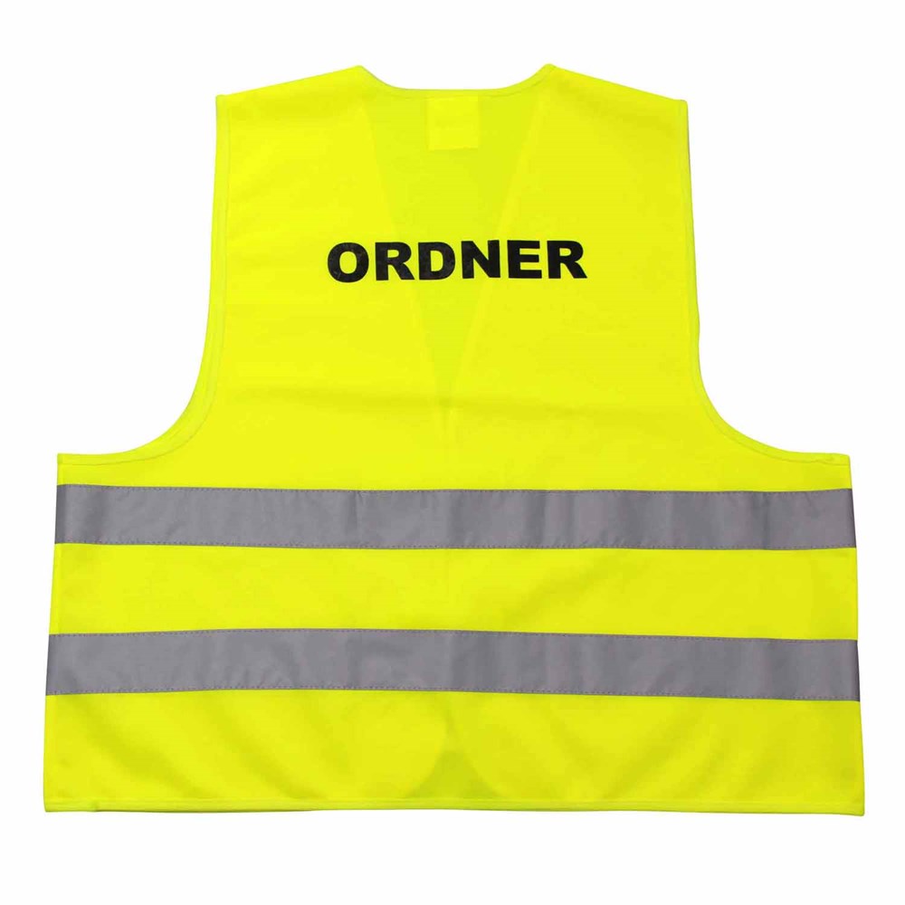 Unsere Warnweste Premium gelb ist aus 100% Polyester, wird nach EN ISO 20471 produziert und ist TÜV-Rheinland geprüft. Mit Anleitung einzeln im wiederverschließbaren Polybeutel verpackt. Durch die beiden Klettverschlüsse ist die Größe variabel einstellbar. Mit zwei reflektierenden Streifen, perfekt vernähte Qualität und Einleger in sieben Sprachen mit den gesetzlichen Pflichtangaben. Mit dem Standardmotiv 'Ordner' auf der Rückseite 1farbig schwarz bedruckt. Ein zusätzlicher Druck auf der Vorderseite ist möglich. Gern erstellen wir Ihnen dazu ein Angebot.