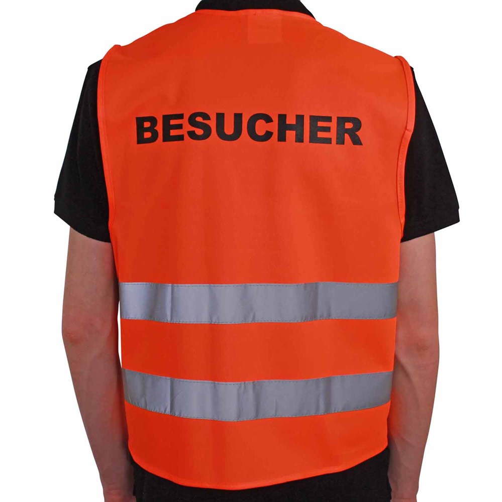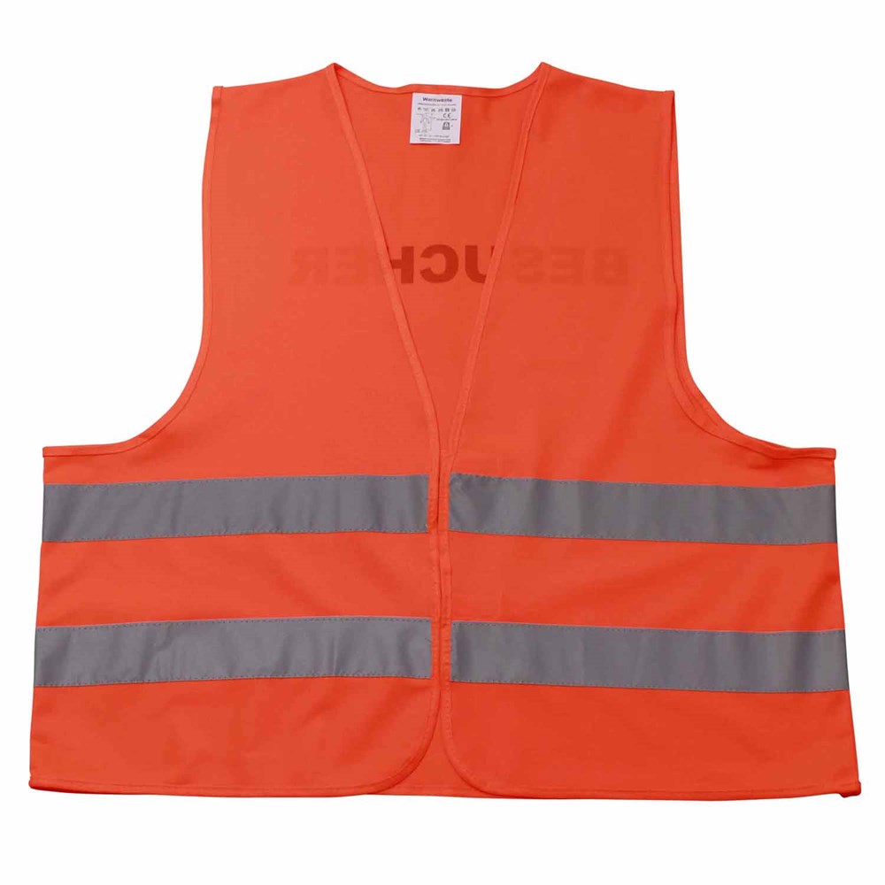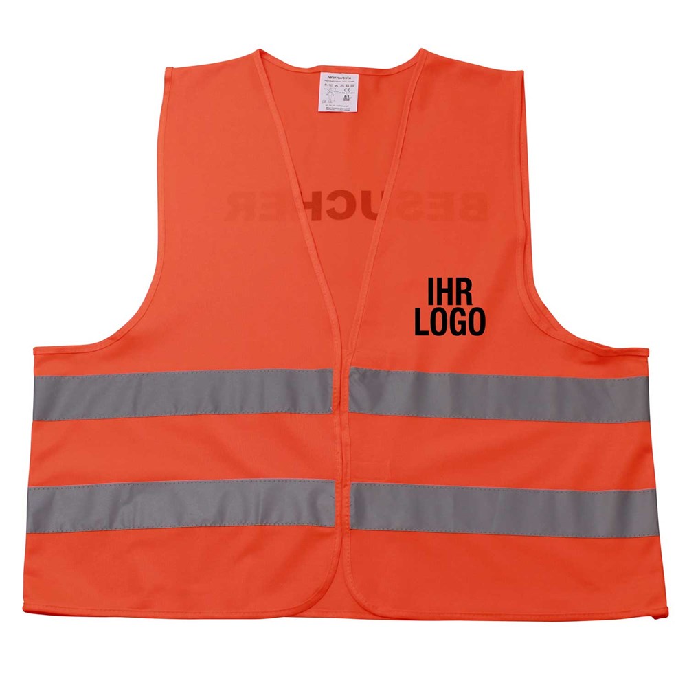 Unsere Warnweste Premium orange ist aus 100% Polyester, wird nach EN ISO 20471 produziert und ist TÜV-Rheinland geprüft. Mit Anleitung einzeln im wiederverschließbaren Polybeutel verpackt. Durch die beiden Klettverschlüsse ist die Größe variabel einstellbar. Mit zwei reflektierenden Streifen, perfekt vernähte Qualität und Einleger in sieben Sprachen mit den gesetzlichen Pflichtangaben. Mit dem Standardmotiv 'Besucher' auf der Rückseite 1farbig schwarz bedruckt. Ein zusätzlicher Druck auf der Vorderseite ist möglich. Gern erstellen wir Ihnen dazu ein Angebot.