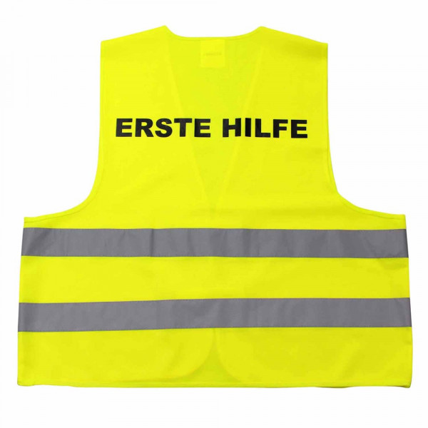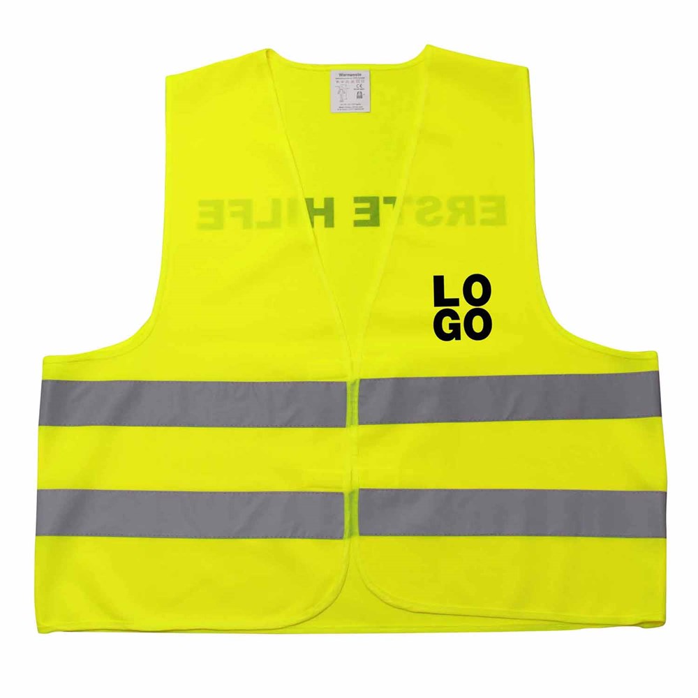 Unsere Warnweste Premium gelb ist aus 100% Polyester, wird nach EN ISO 20471 produziert und ist TÜV-Rheinland geprüft. Mit Anleitung einzeln im wiederverschließbaren Polybeutel verpackt. Durch die beiden Klettverschlüsse ist die Größe variabel einstellbar. Mit zwei reflektierenden Streifen, perfekt vernähte Qualität und Einleger in sieben Sprachen mit den gesetzlichen Pflichtangaben. Mit dem Standardmotiv 'Erste Hilfe' auf der Rückseite 1farbig schwarz bedruckt. Ein zusätzlicher Druck auf der Vorderseite ist möglich. Gern erstellen wir Ihnen dazu ein Angebot.