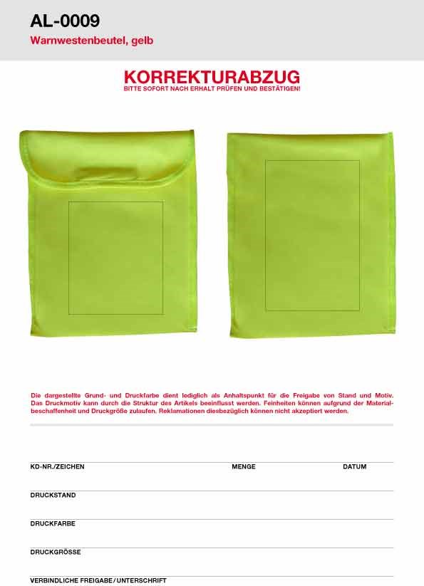 Unser Warnwestenbeutel CLASSIC aus 100% Polyester mit Klettverschluss ist dür eine Warnweste geeignet. Sie können Ihr Motiv auf der Vorder- oder Rückseite aufdrucken.