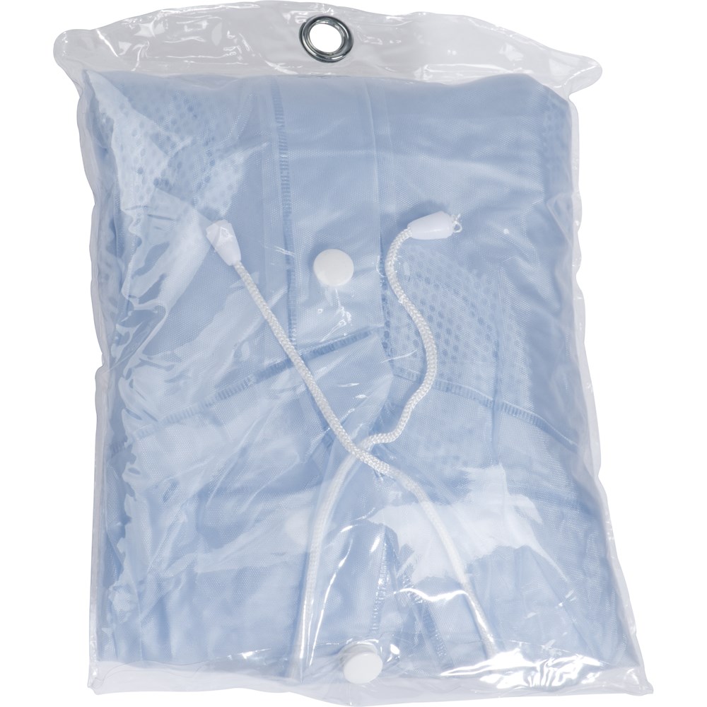 PVC-Regenjacke (Einheitsgröße XL) transparent gefrostet mit Kapuze, zwei Fronttaschen und Druckknöpfen. Ihren Werbeaufdruck bringen wir auf der Brust (Herzseite) an.