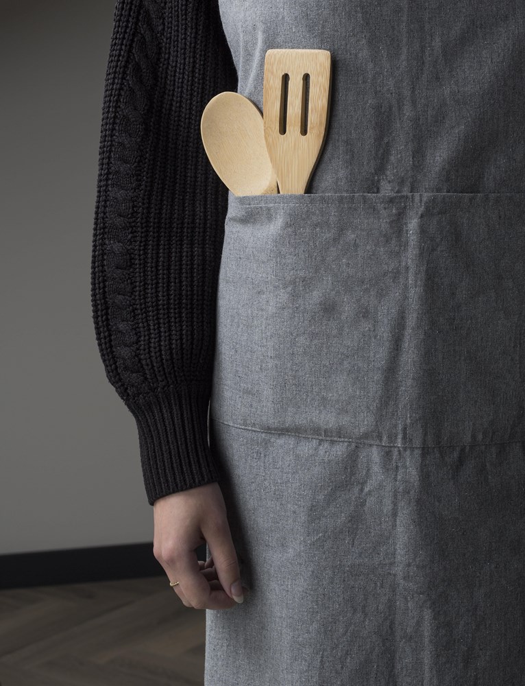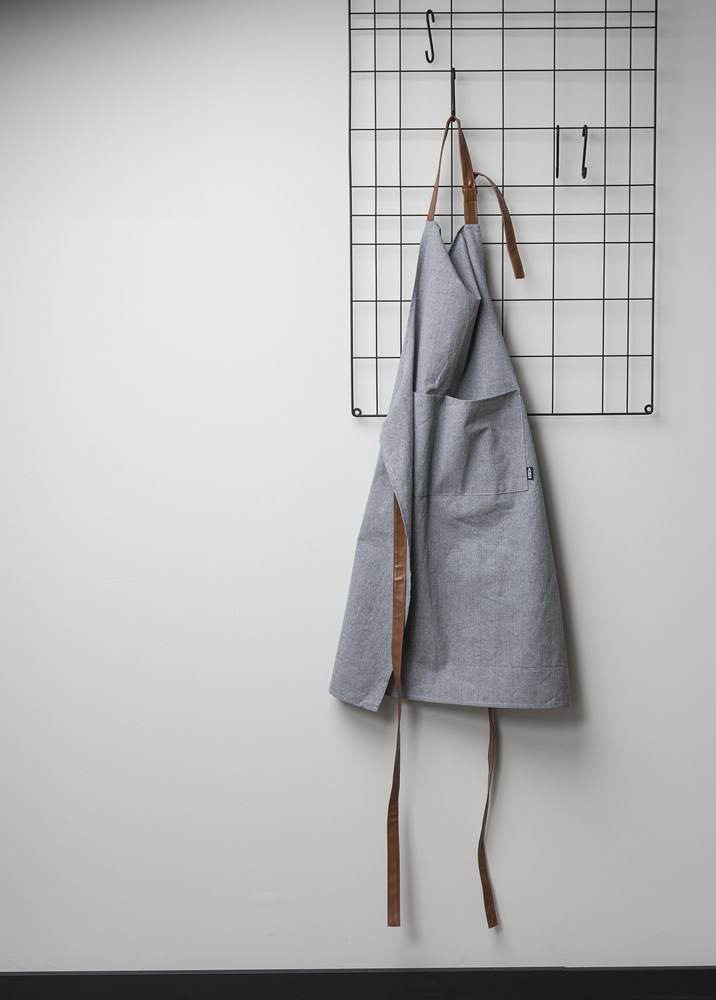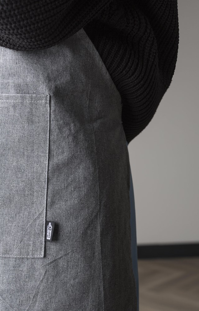 Schürze aus 50% rPET und 50% Baumwolle mit verstellbaren PU-Bändern. Inklusive Fronttasche.