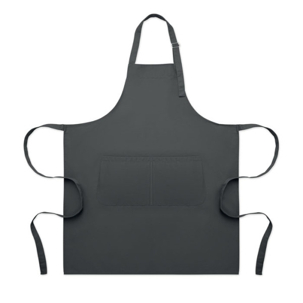 Lange, verstellbare Küchenschürze aus 240 g/m² Polycotton (35% Baumwolle, 65% Polyester) mit zwei Fronttaschen und verstellbarem Gurt mit Metallschnalle.
