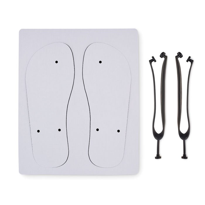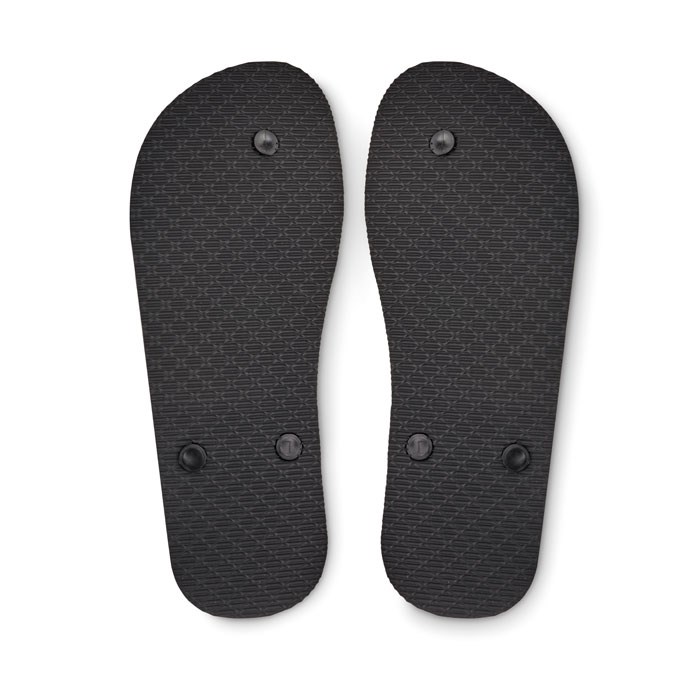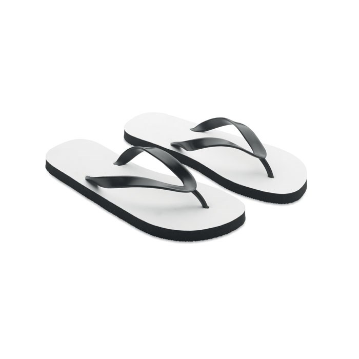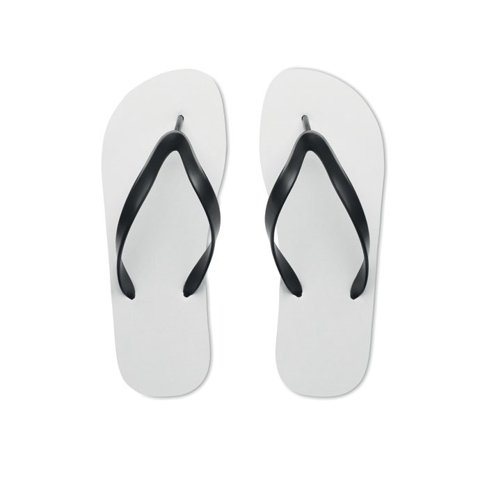Sublimations-Zehensandalen mit Riemchen aus PVC. Sohle aus Gummi mit Bezug aus Polyester. Größe 38-41. Der Artikel kommt unmontiert.