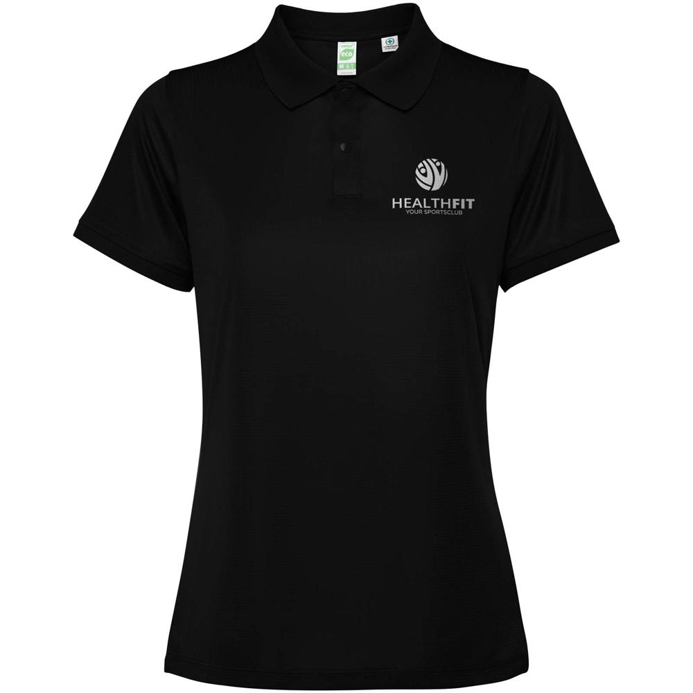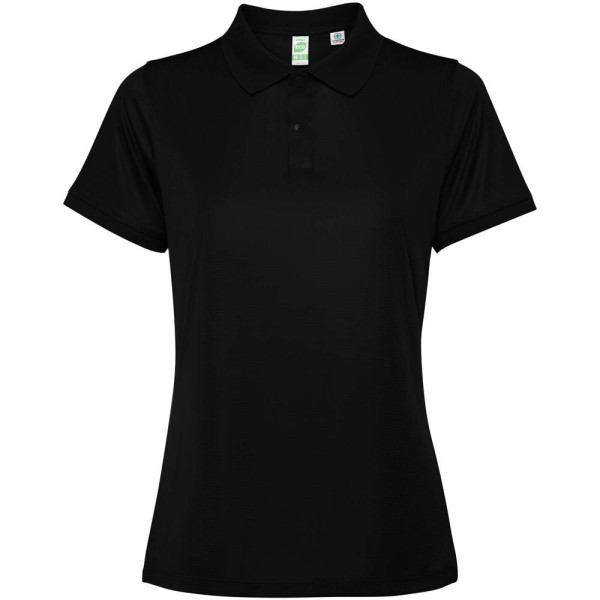 Kurzärmeliges, tailliertes Poloshirt für Damen. Verstärkte und verdeckte Nähte am Innenkragen. 1×1-Rippstrick an Bündchen und Kragen. Seitennähte. Knopfleiste mit 3 Knöpfen und Seitenschlitze.