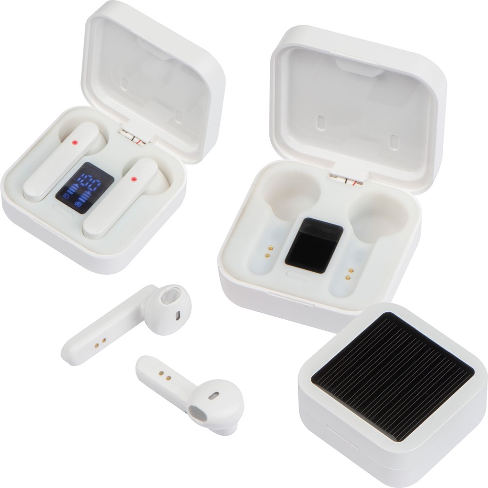 In-Ear Bluetooth Kopfhörer mit Ladestandsanzeige und Ladestation. Diese kann entweder über das Solarfeld im Deckel oder über das Ladekabel (im Lieferumfang enthalten) geladen werden. Akku: 35mAh, Laufzeit: 2-3 Stunden, Ladezeit mit Kabel: ca. 1 Stunde, Ladzeit mit Solarfeld: ca. 4 Stunden. Ihre Werbung wird auf der Unterseite der Box angebracht.