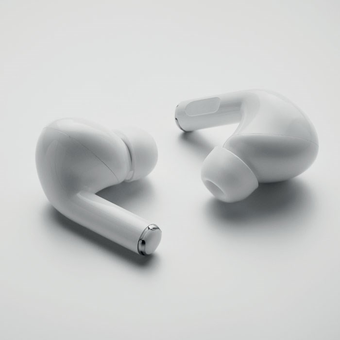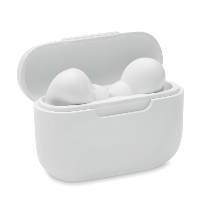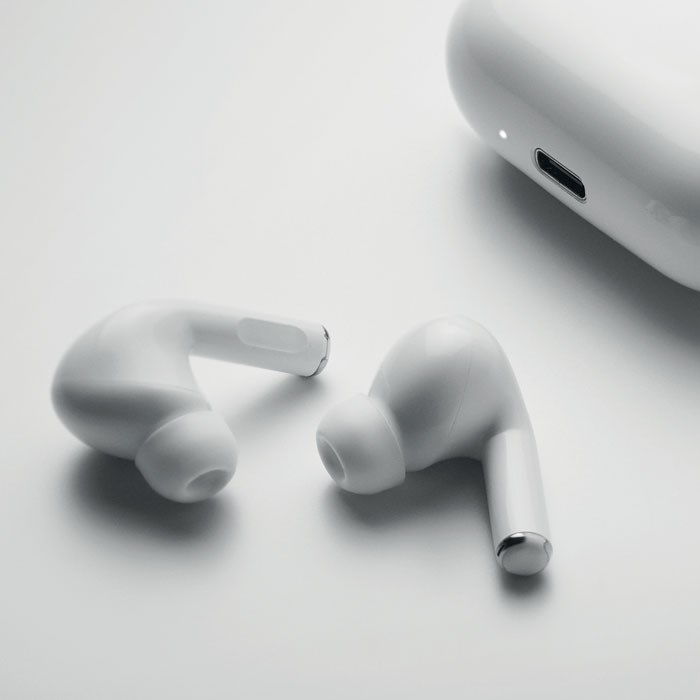 5.3 TWS True Wireless Stereo Ohrhörer-Set mit Mikrofon. Recycelter ABS. Inkl. eingebautem 30mAh Batterie. Typ-C Eingang und Typ-C Ladekabel. Spieldauer ca. 3 Stunden. Automatische Kopplung. Ladebox mit 180 mAh Batterie.