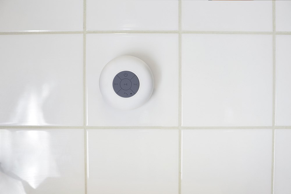 BT/Wireless-Lautsprecher aus Kunststoff, wasserabweisend, Saugnapf zur Befestigung an glatten Oberflächen, inkl. Akku (3,7V Li-ion 400mAh), Output: 3W/5V, Ladezeit: ca. 4,5 Std., Laufzeit: ca. 2 Std.