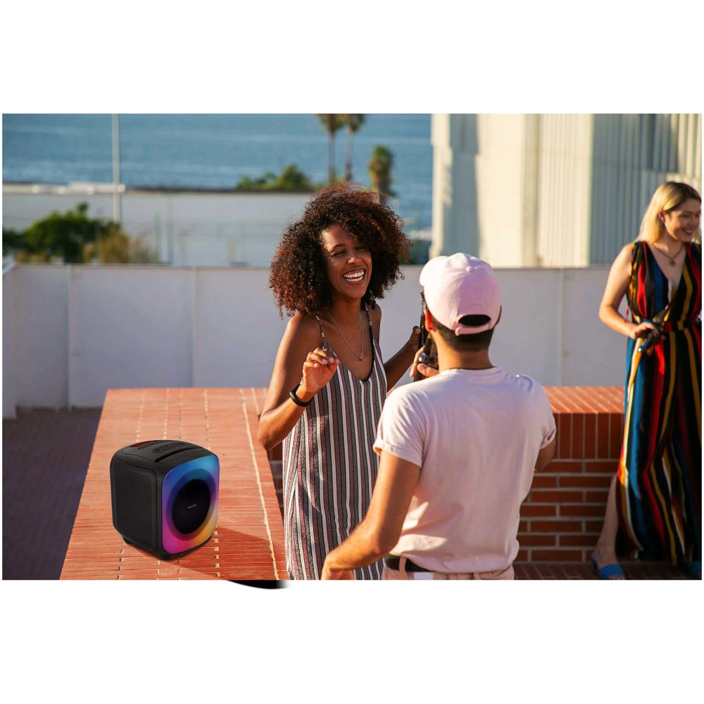 Der Jaia Karaoke-Lautsprecher liefert mit 40 W einen hochwertigen Sound, der jede Party aufwertet. Er verfügt über bis zu 6 lebhafte Lichteffekte, die für die perfekte Atmosphäre sorgen. Mit dem einstellbaren BASS können Sie Ihr Hörerlebnis noch besser anpassen. Über den AUX IN-Eingang und den Mikrofoneingang können Sie ganz einfach weitere Geräte anschließen. Der leistungsstarke Akku hält bis zu 9 Stunden nach einer 6-stündigen Aufladung und sorgt für Musik die ganze Nacht lang.