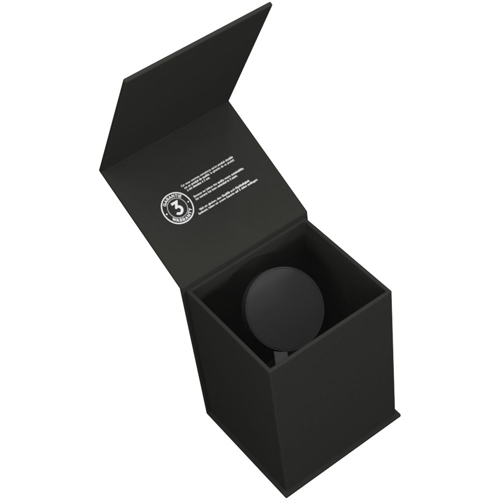 Magnetisches, kabelloses Ladegerät mit leuchtendem Logo und 2 separaten Induktionsausgängen zum gleichzeitigen Laden von 2 Geräten. Das runde Teil ist ein magnetisches kabelloses 15W Ladegerät. Um die 15W Ladeleistung nutzen zu können, muss das Ladegerät mit dem mitgelieferten Kabel an ein Netzteil mit mindestens 20W angeschlossen werden. Die Basis ist mit einem USB-C-Eingang und -Ausgang sowie einem 5W Induktionsausgang zum Aufladen eines Ohrhörergehäuses (Typ AirPods) ausgestattet. Das Ladegerät wird mit einem magnetischen Aufkleber geliefert, um die Kompatibilität mit allen Handys zu gewährleisten (das Gerät muss induktionsfähig sein). Wenn das Telefon nicht über die MagSafe Technologie verfügt (ab iPhone 12), kann der Aufkleber auf der Rückseite des Telefons angebracht werden, um es mit der Magnethalterung kompatibel zu machen. Wird mit einem Ladekabel aus recyceltem PET geliefert. Größe des Ladegeräts: 7 x 8 x 12,5 cm. Verpackt in einer Geschenkbox (11 x 10 x 12,5) mit Magnetverschluss. Inklusive 3 Jahre Garantie.