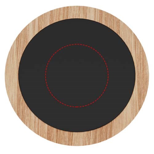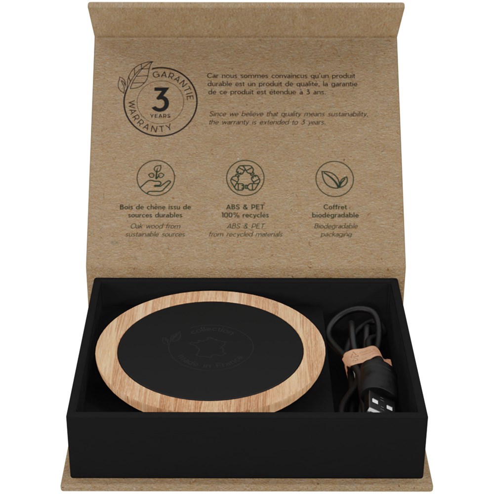 Kabelloses 10W Ladepad (8 x 0,8 cm), hergestellt in der EU aus französischem Eichenholz mit Soft-Touch Oberfläche. Diese Ladestation ist Qi-kompatibel und kann mit einem leuchtenden Logo individuell gestaltet werden. Wird in einer Geschenkbox aus Recyclingpapier mit Magnetverschluss geliefert.