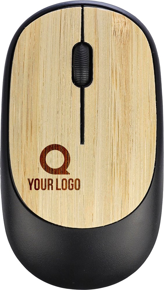 Kabellose ABS-Maus mit Bambus-Details. Inklusive Batterie. 2,4 GHz mit USB-Empfänger und 1.200 DPI. Einzeln verpackt in einer braunen Pappschachtel.