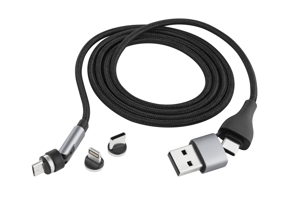 All inclusive Profi-Ladekabel aus recyceltem Material mit Datentransfer & 3A Fast-Charging. Einfachste Handhabung dank der magnetischen Ladeadapter (USB-C, Lightning®, Micro- USB) - einfach in Ihr Handy einstecken und so den Lade Port schützen und per magnetischem Klick aufladen - ideal für alle modernen Handys und Tablets. 1m Ladekabel, 3 Magnetadapter Micro-USB/USB-C/ Lightning®, 3A, Datentransfer, VPE 300, Recycling Anteil 26%,