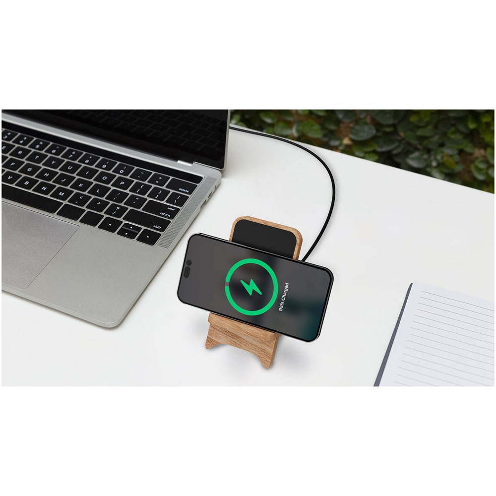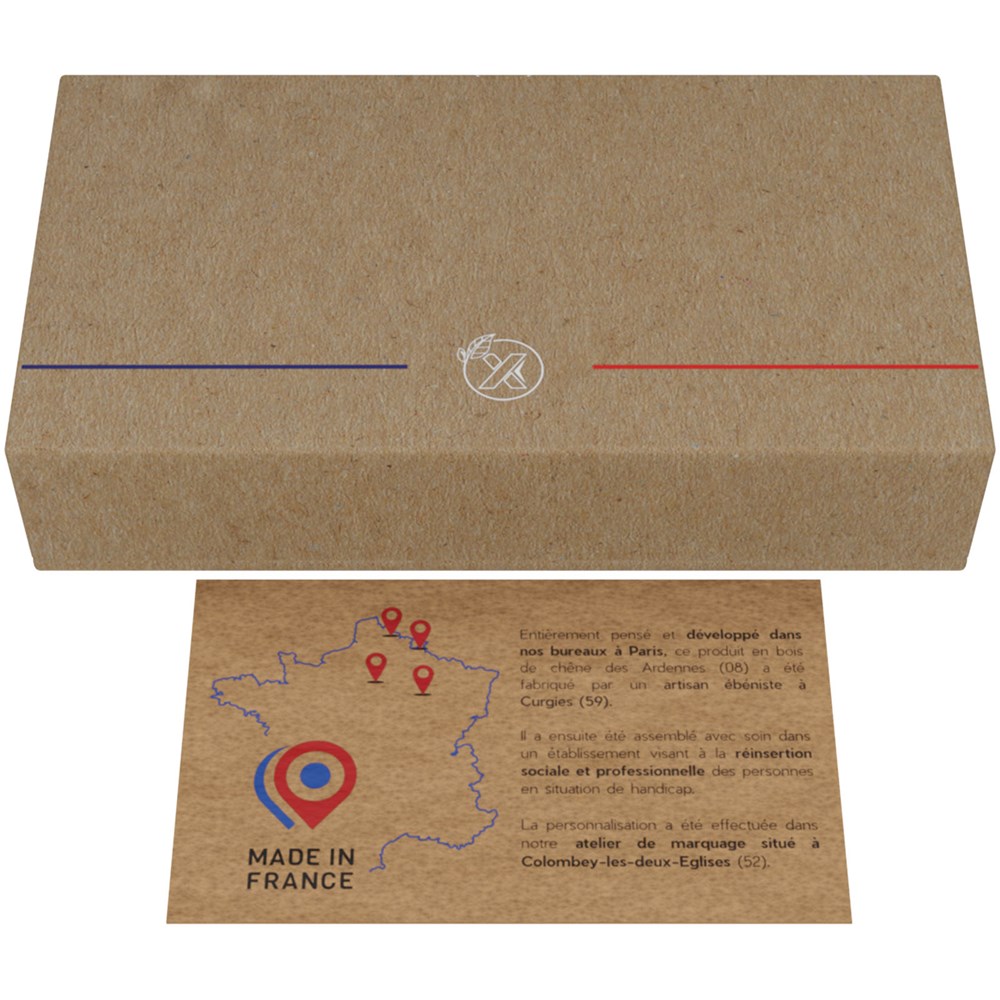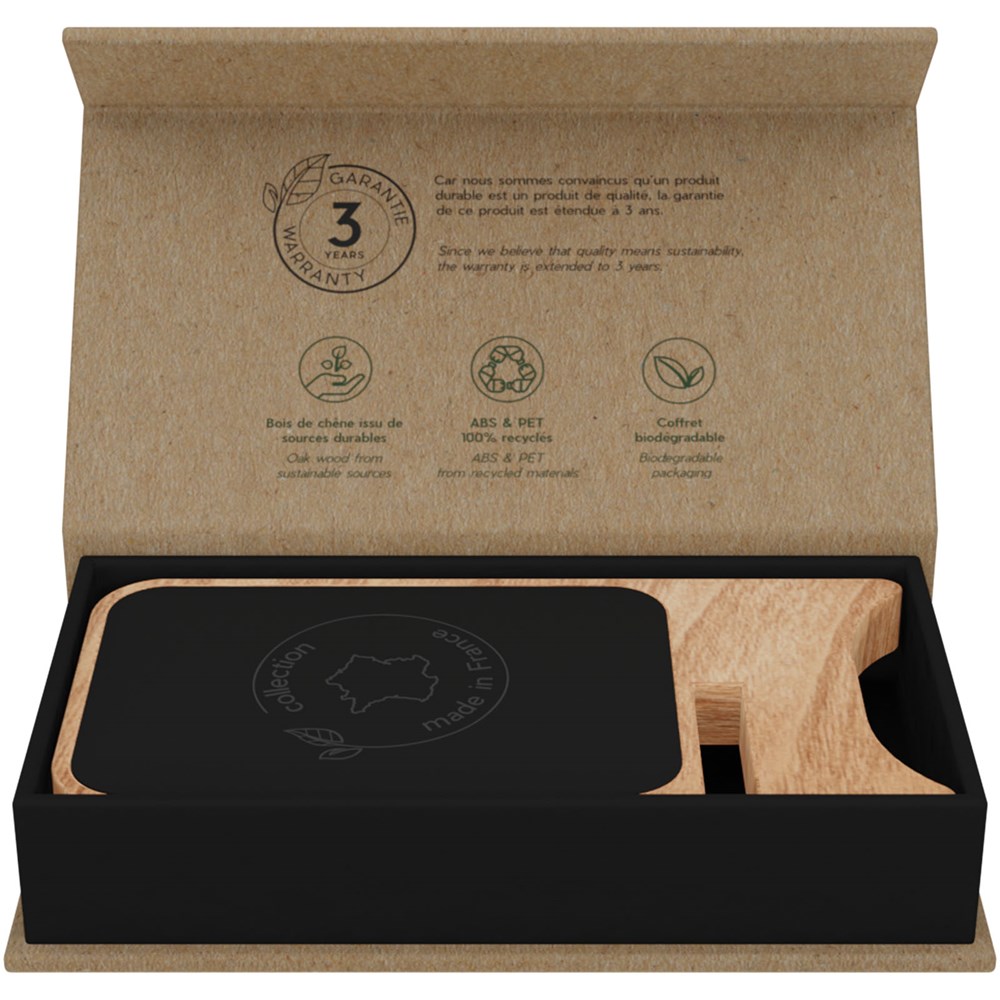 Kabellose 10W Ladestation, hergestellt in der EU aus französischem Eichenholz mit Soft-Touch Oberfläche. Hergestellt von einem Schreiner in Nordfrankreich, wird sie dann zusammengebaut und individuell angepasst (ebenfalls in Frankreich). Dank des doppelten kabellosen Sensors können Geräte sowohl in vertikaler als auch in horizontaler Position aufgeladen werden. Dieser Artikel kann mit einem leuchtenden Logo individuell gestaltet werden. Qi-kompatibel. Größe des Ständers: 4 × 7 × 1,2 cm. Verpackt in einer Geschenkbox aus recyceltem Papier (15 × 8 × 2,7 cm) mit Magnetverschluss. Inklusive 3 Jahre Garantie.