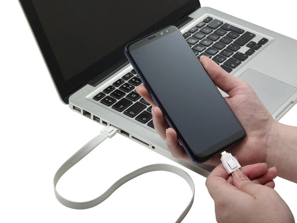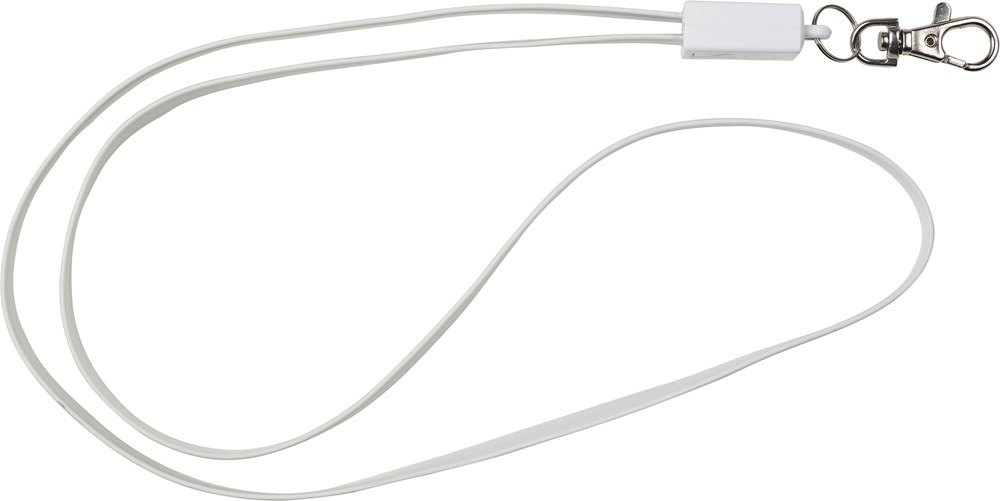 Schlüsselband 'Companion' mit Ladekabel aus TPE-Kunststoff und Karabinerhaken. Die Kabellänge beträgt ca. 90 cm, mit USB- und Micro-USB-Verbindung. Der Micro-USB-Stecker kann durch Drehen auch als Lightning Stecker verwendet werden.
