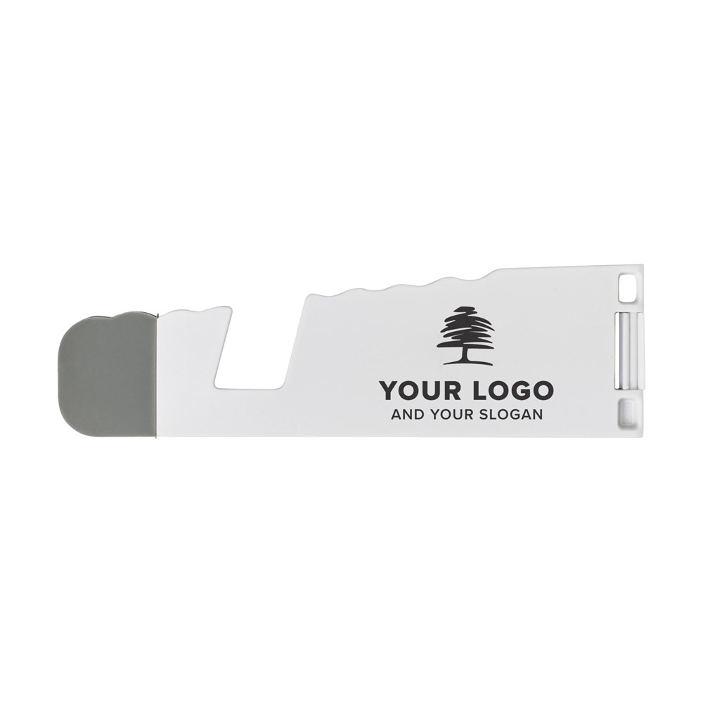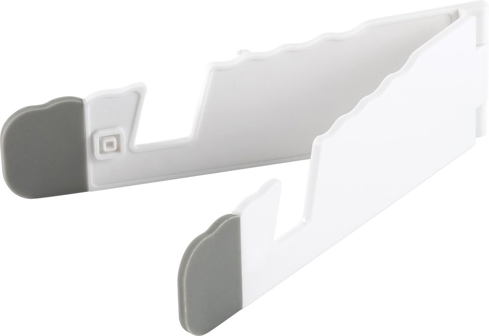 Faltbarer Telefonhalter & Tablethalter 'Haltern' aus Kunststoff mit silikonbeschichteten Spitzen.