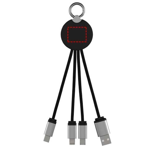 Beleuchtetes Logo-Ladekabel mit Gummi- und Metalloberfläche, ausgestattet mit drei Steckern (Typ-C, Android, iPhone). Es können bis zu drei Geräte gleichzeitig aufgeladen werden. Länge der Kabel (einschließlich Stecker): 10 cm. Kabel aus recyceltem PET-Kunststoff und die Verpackung besteht aus recyceltem Papier und recyceltem Kunststoff.
