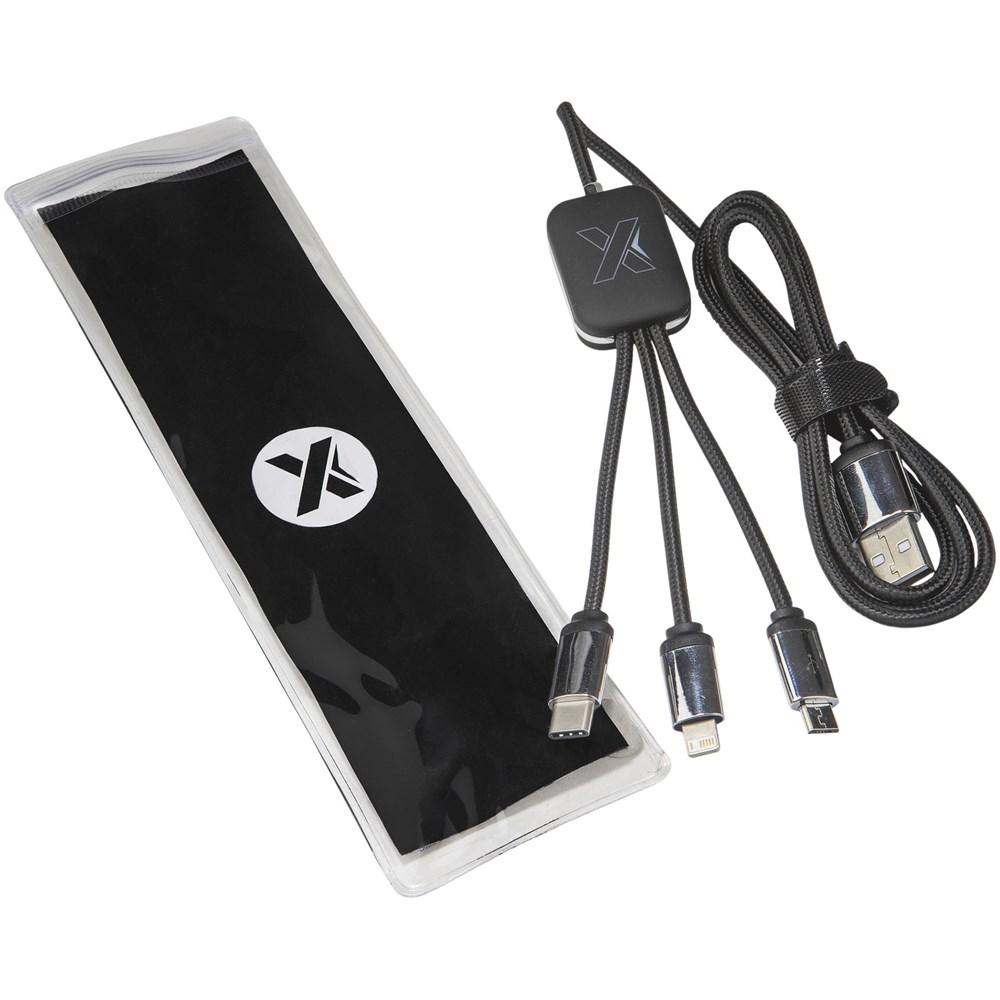 Beleuchtetes Logo-Ladekabel mit Gummi- und Metalloberfläche, ausgestattet mit drei Steckern (Typ-C, Android, iPhone). Es können bis zu drei Geräte gleichzeitig aufgeladen werden. Länge der Kabel (einschließlich Stecker): 10 cm. Gesamtlänge des Kabels: 1 Meter. Kabel aus recyceltem PET-Kunststoff und die Verpackung besteht aus recyceltem Papier und recyceltem Kunststoff.