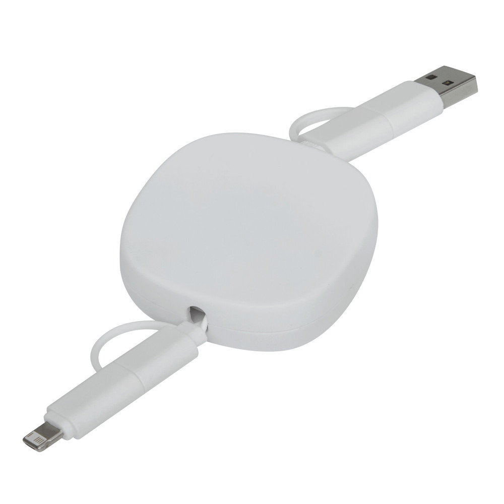 Lade- und Datenkabel TRANSFER SQUARE, aufrollbar (Länge: ca. 92 cm): zum Aufladen von Smartphones, USB-betriebenen Geräten und Laptops (65 W Leistungsübertragung) sowie zum Übertragen von Daten, inkl. 2 Ladesteckern (USB Typ C, Kombistecker Micro-USB/Lightning®), kombinierter USB Typ A / Typ C Eingangsstecker, in Box