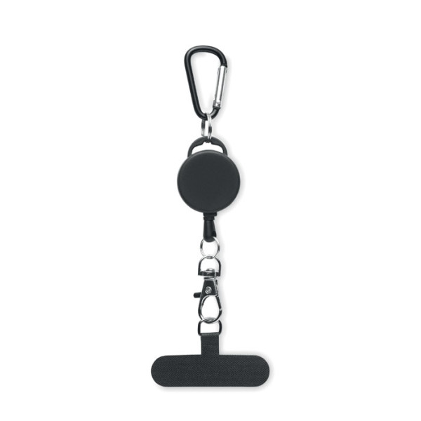 Einziehbarer Smartphone-Halter/Ausweishalter aus ABS mit Karabiner aus Aluminium. Mit Universalhalter. Der Karabiner ist NICHT als Sicherung beim Klettern geeignet.