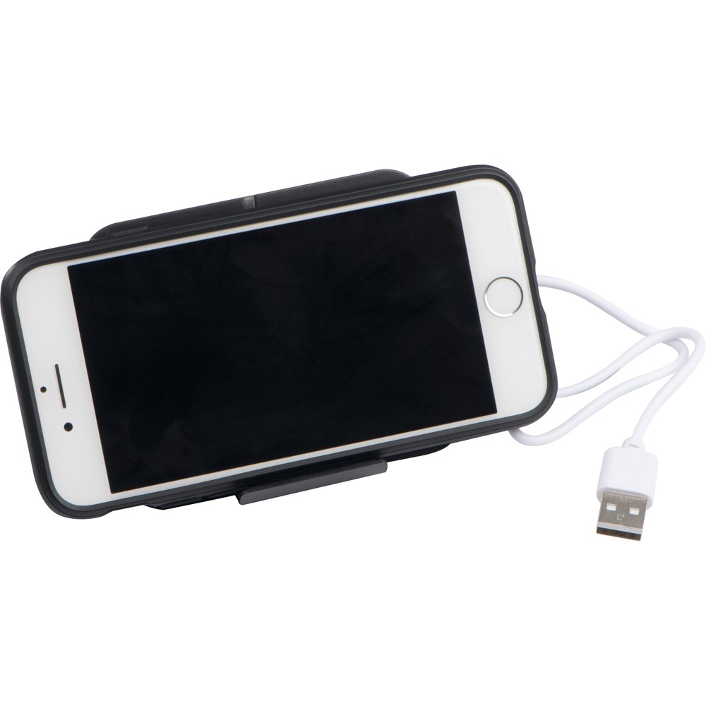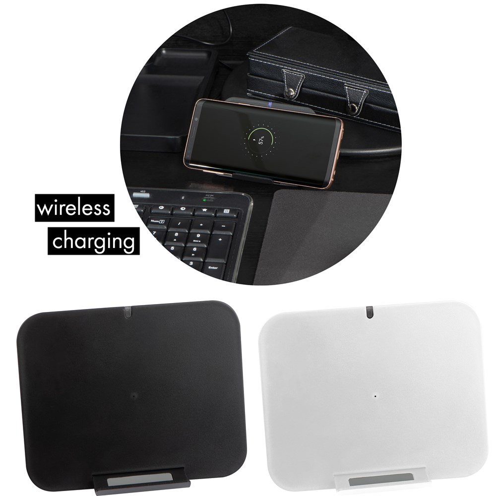 Induktionsladegerät aus Kunststoff inkl. USB-Ladekabel. Laden Sie Ihr Smartphone einfach ohne Kabelverbindung auf. Der Wireless Charger dient gleichzeitig auch als Ständer für Ihr Smartphone. Ihre Werbung drucken wir vorne mittig auf das Induktionsladegerät.