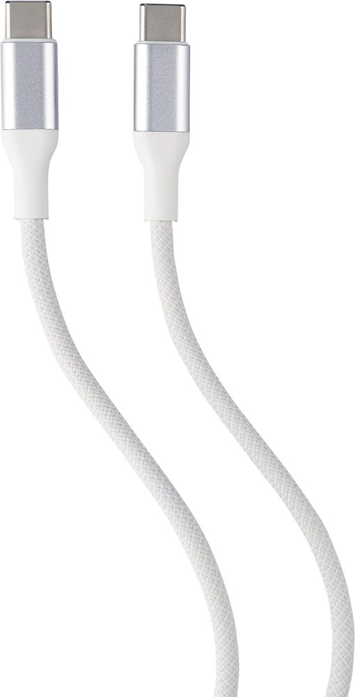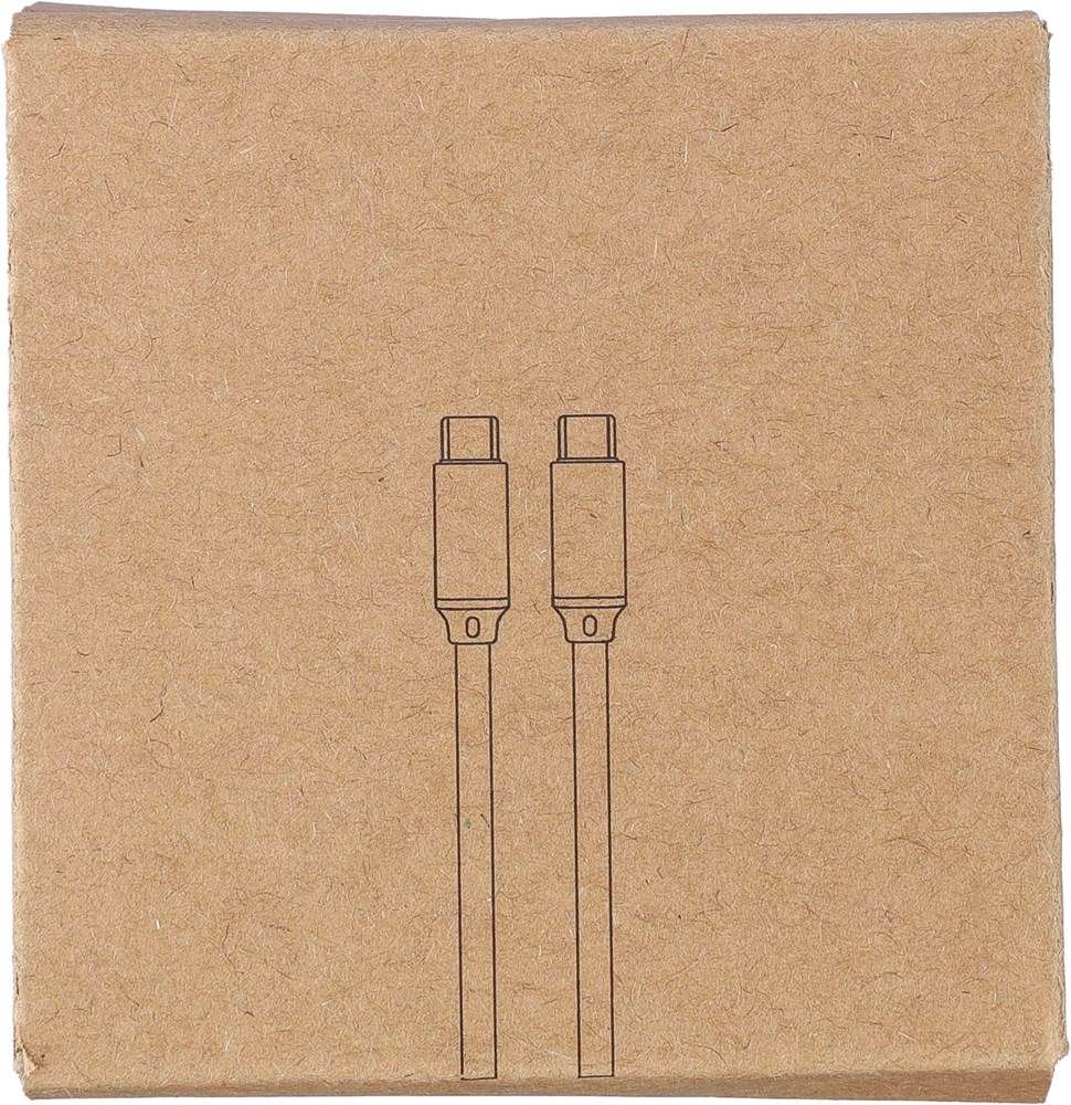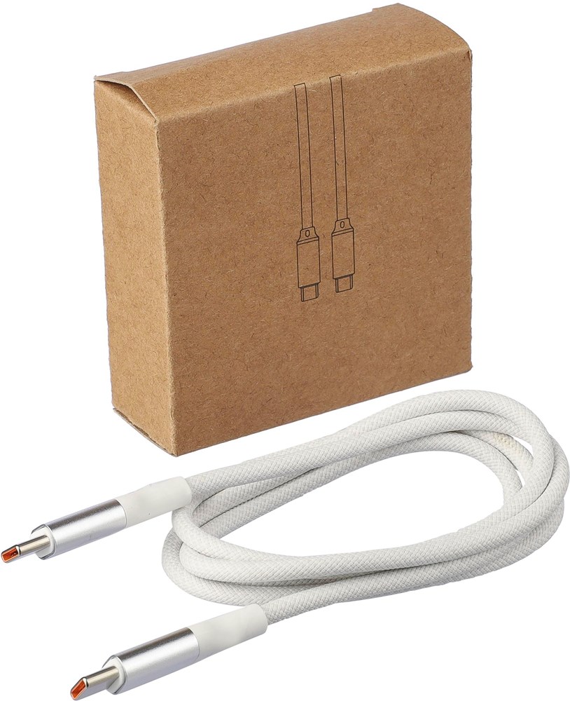 Nylon Typ-C auf Typ-C Daten- und Ladekabel mit einer Länge von 1 Meter. Datenübertragungsgeschwindigkeit von 120 Mbps. Die Aluminiumbuchse ist vergrößert, um eine größere Druckposition zu ermöglichen. 35W Ladeleistung. Einzeln verpackt in einem braunen Geschenkkarton.