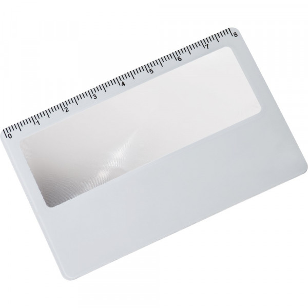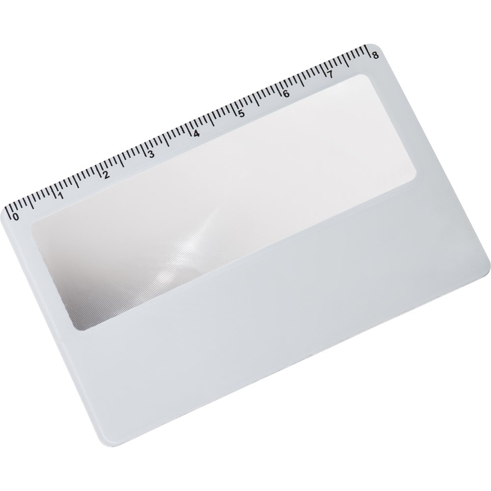 Leselupe im Scheckkartenformat mit Lineal an der Oberseite. Idealer Mailingverstärker oder Zugabeartikel (leicht+flach). Ihre Werbung drucken wir auf das weiße Feld.