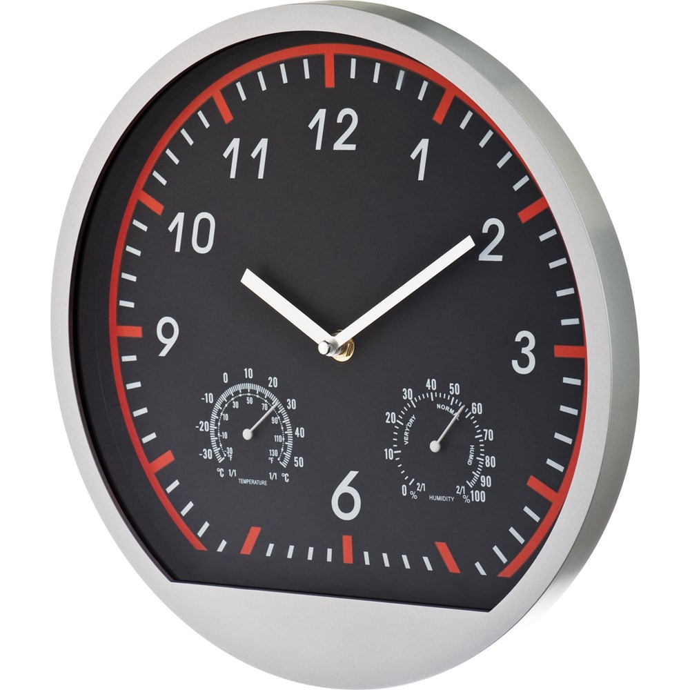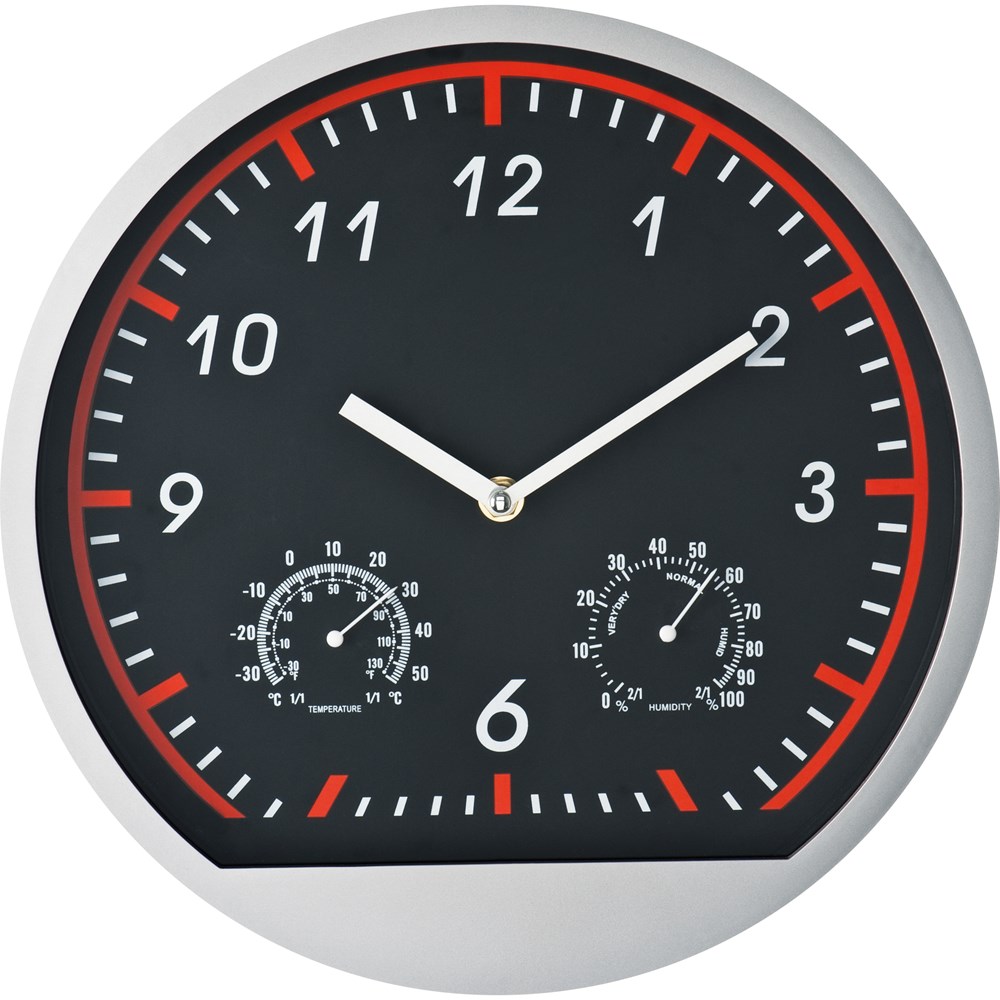 Wanduhr im coolen Sportdesign. Die Uhr verfügt über ein Thermo- und ein Hygrometer. Ihre Werbung drucken wir auf den Rahmen unterhalb der sechs. Exklusive einer AA Batterie (Bestellen Sie diese gleich mit, siehe letzte Seite oder Artikel 999300).