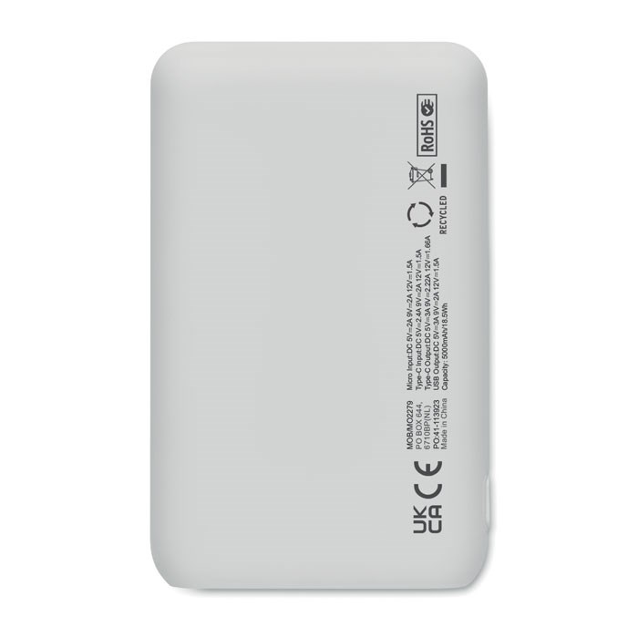 Powerbank 5000 mAh aus recyceltem ABS. Geeignet zum Betrieb von Smartphones. Ausgang: 1 x Typ-C, 2 x Typ-A & 1 x Typ-B. Eingang: 2-in-1 Typ C & Typ-A.