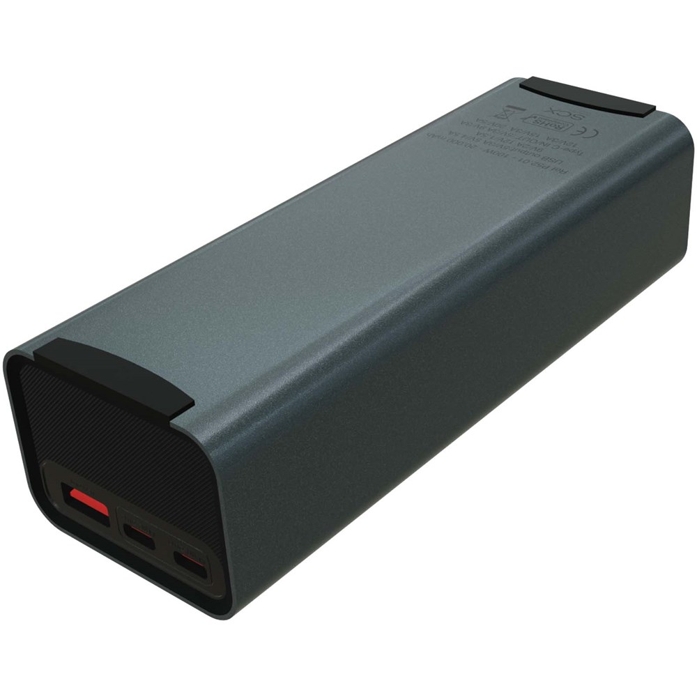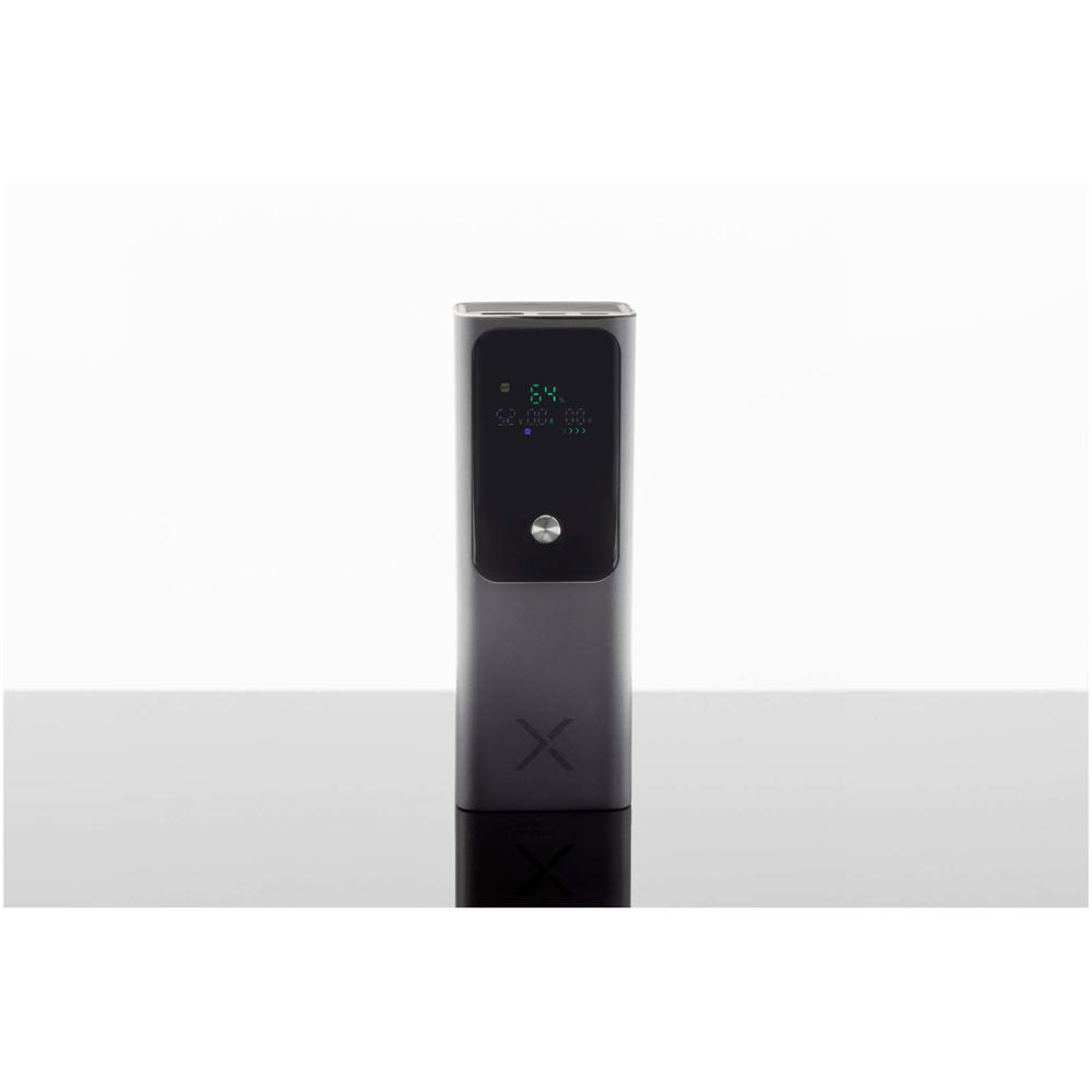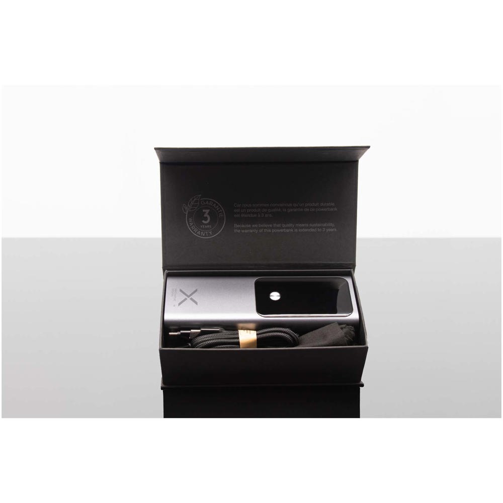 Leistungsstarke 100 W (20.000 mAh) Laptop-Powerbank mit zwei USB-C- und einem USB-A-Anschluss zum Aufladen mehrerer Geräte unterwegs. Ausgestattet mit einem smarten TFT-Display zur Anzeige des Ladezustands in Echtzeit. Verpackt in einem Beutel aus Recyclingbaumwolle und geliefert in einer Geschenkbox aus recyceltem Karton.