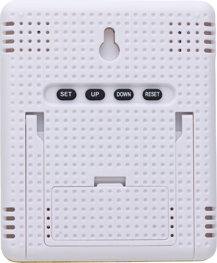 Wetterstation aus Bambus und ABS, mit klappbarem Ständer. Funktionen: Uhr, Jahr, Temperatur, Luftfeuchtigkeit. Inklusive Batterien.