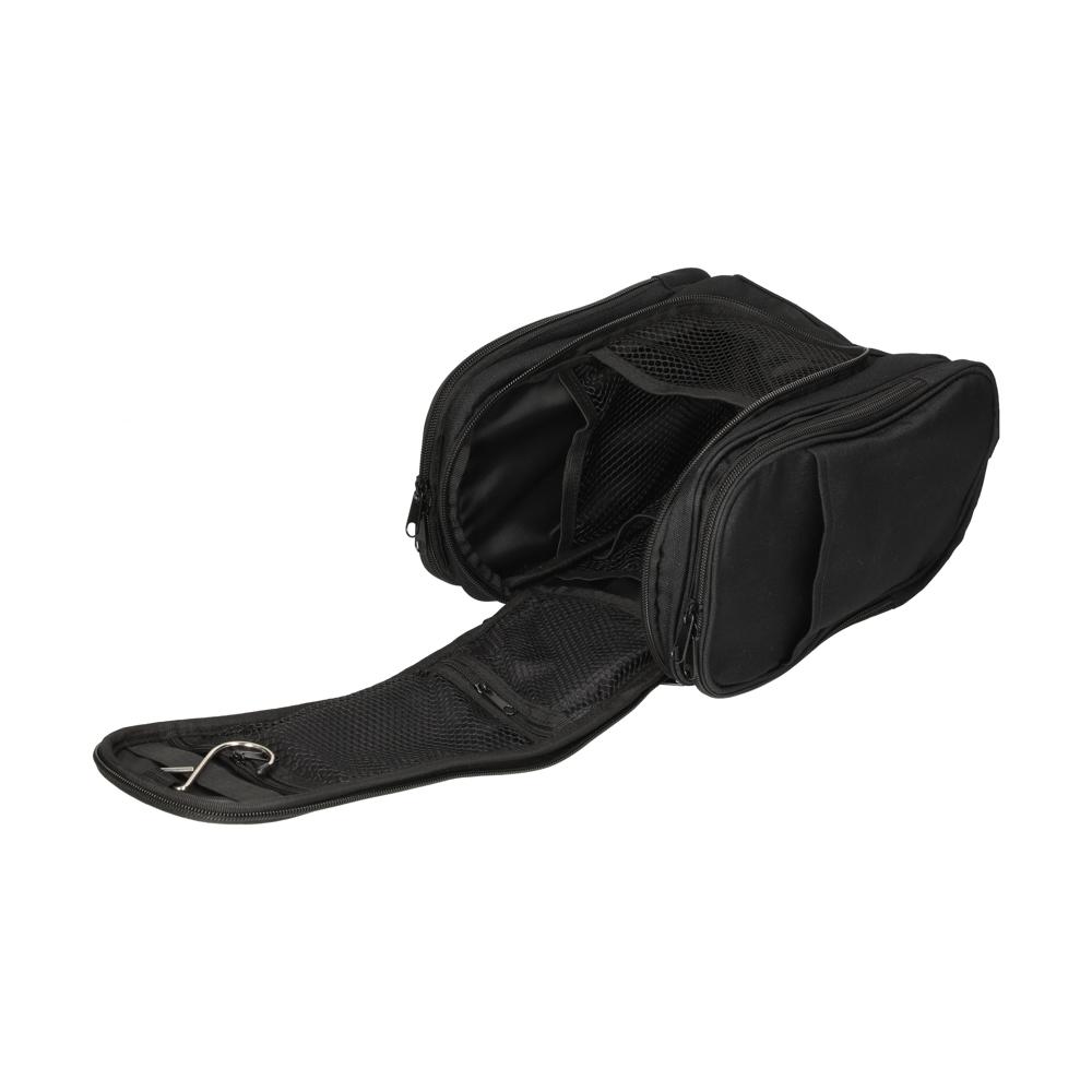 Schwarzer Kulturbeutel aus Polyester mit reichlich Platz. Der Kulturbeutel überzeugt mit einem großem Hauptfach, das fünf Netzfächern als auch ein oberes Netzfach mit Reißverschluss sowie Haken zum Aufhängen beinhaltet. Des Weiteren gibt es zwei weitere Außentaschen, die je ein weiteres Netzfach und integrierte Gummilaschen für z.B. Utensilien wie Zahnbürsten etc. enthalten. Der große Tragegriff am Kulturbeutel und die kleinen seitlichen Henkel, sorgen für einen angenehmen Tragekomfort.