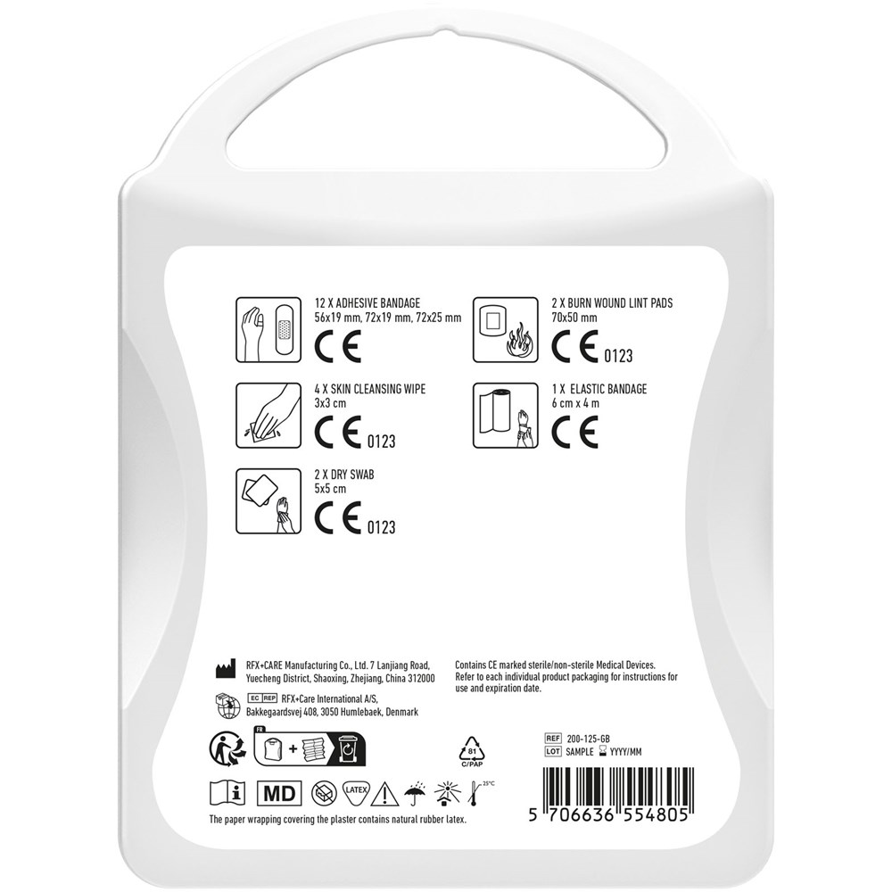 Dieses klassische Erste-Hilfe Set ist perfekt geeignet für den Gebrauch zu Hause oder im Auto, um bei Verletzungen und Unfällen vorbereitet zu sein. Inhalt: 12 wasserfeste Pflaster, 4 hautreinigende Tupfer, 2 Trockentupfer, 1 elastischer Verband, 2 Mullbinden für Brandwunden. Alle im Set enthaltenen Erste-Hilfe- und Pflegeprodukte erfüllen alle geltenden EU-Vorschriften. Preis inkl. vollfarbigem Druck.