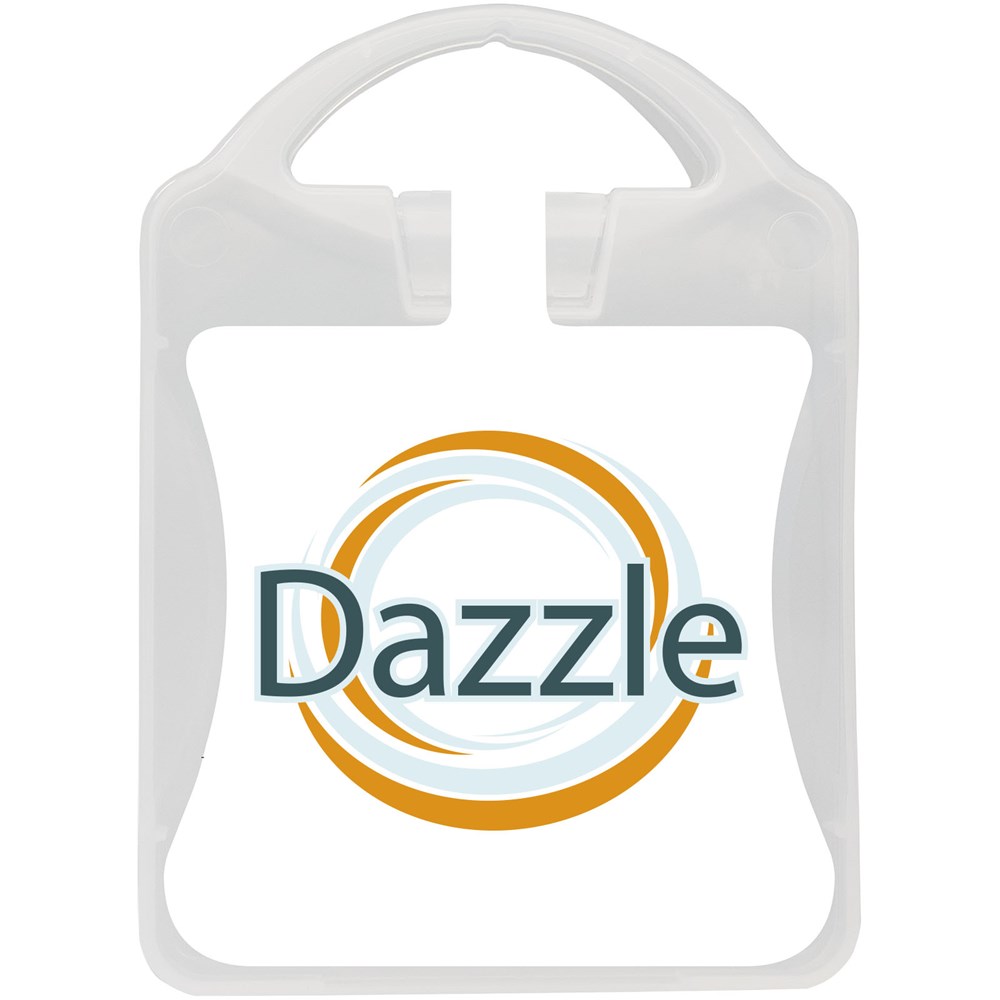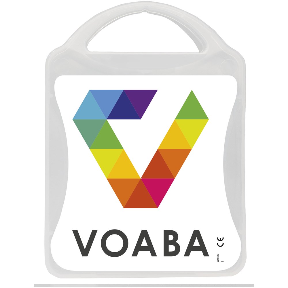 Dieses umfangreiche Erste-Hilfe Set ist ein handliches Set für Ihrem Haushalt um Verletzungen und Unfälle zu behandeln. Inhalt: 1 Erste-Hilfe-Leitfaden, 1 Blasenpflaster, 12 wasserfeste Pflaster, 1 Metall Pinzette, 1 Schere, 1 Dreieckstuch, 1 Paar Einmalhandschuhe, 2 Wundkompressen, 1 steriler Wundverband, 2 Trockentupfer, 4 hautreinigende Tupfer, 1 Mund-zu-Mund-Schutz. Alle im Set enthaltenen Erste-Hilfe- und Pflegeprodukte erfüllen alle geltenden EU-Vorschriften. Preis inkl. vollfarbigem Druck.