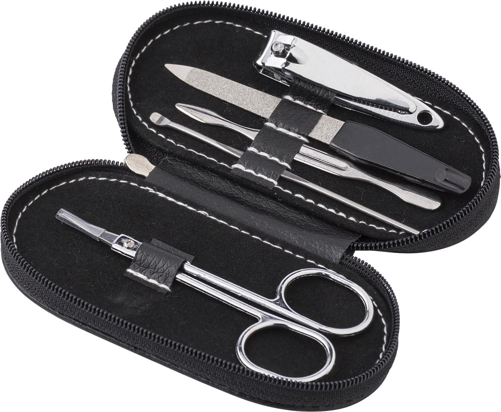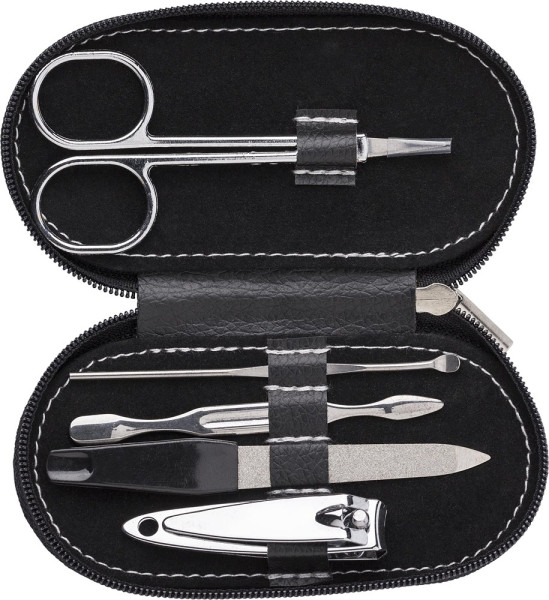 Maniküre-Set in einem Etui bestehend aus Schere, Nagelfeile, Nagelknipser, Nagelhautschieber und Nagelzange.