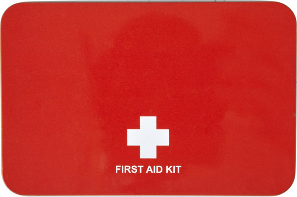 Erste-Hilfe-Set in Metallbox, bestehend aus Schere, Mullbinde, Kreppband, 4 Desinfektionstüchern, 5 Pflastern und Verband. Nicht verkäuflich in der Schweiz. Dieses Produkt darf nur innerhalb der Europäischen Union verkauft und geliefert werden.