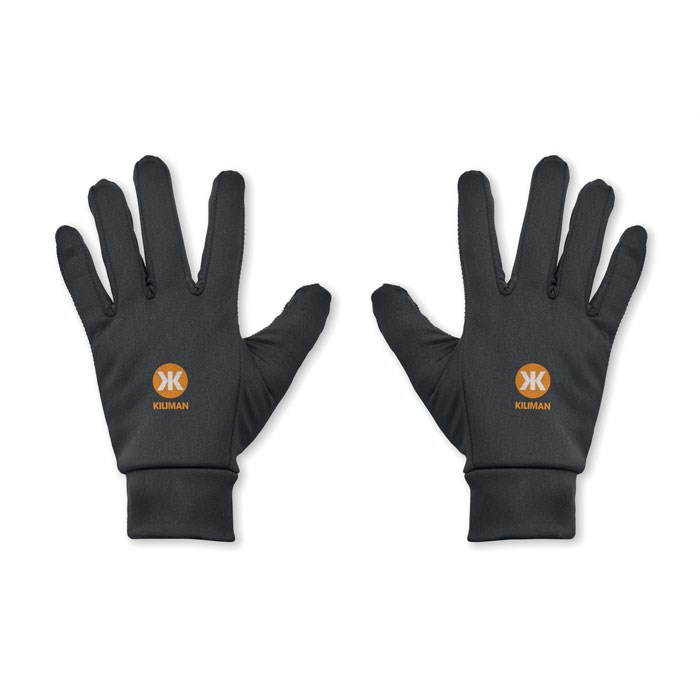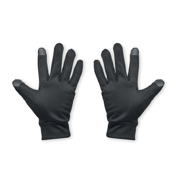 Touchscreen Sporthandschuhe aus Polyester. Zwei Fingerspitzen sind speziell gearbeitet, so dass Sie Touchscreens problemlos bedienen können. Handfläche mit Anti-Rutsch-Noppen.