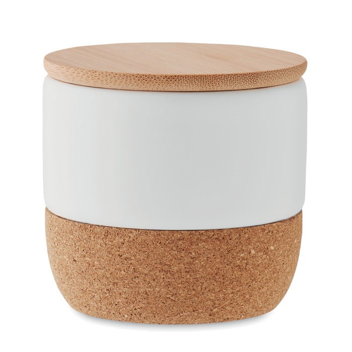 Kerze im Halter aus Steingut. Deckel aus Bambus und Korkboden. Wachs auf pflanzlicher Basis. Aroma: Frische Wäsche. 80 g. Brenndauer: 7,5 Stunden. Bambus ist ein natürliches Produkt, es kann daher zu leichten Abweichungen in Farbe, Dekor und Maßen kommen.