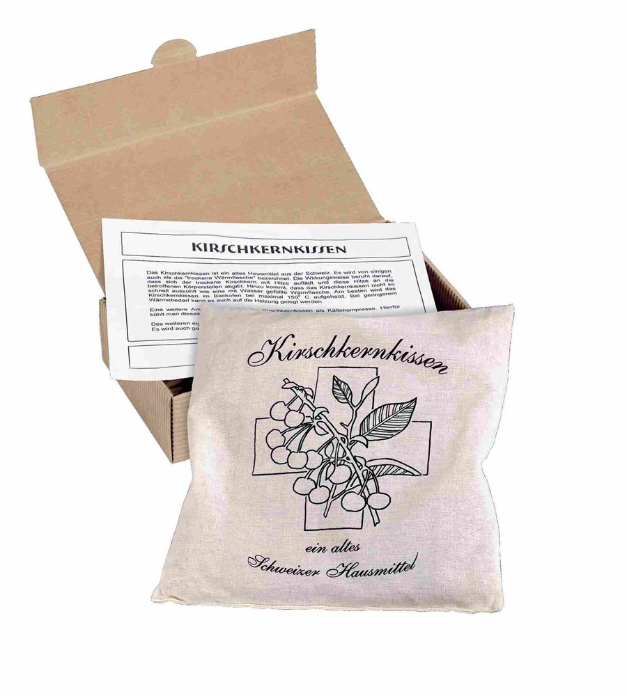 Kirschkernkissen nach dem Ursprung des altbewährten Schweizer Hausmittels. Der Natur-Baumwollstoff kann ab 100 Stück bedruckt werden. Andere Abmessungen auf Anfrage sind möglich. Das Standardkissen im Format 24 x 24 cm ist der ideale Wärmebringer. Schön geschützt verpackt im Präsentkarton. Inhalt: ca. 550 g Kirschkerne